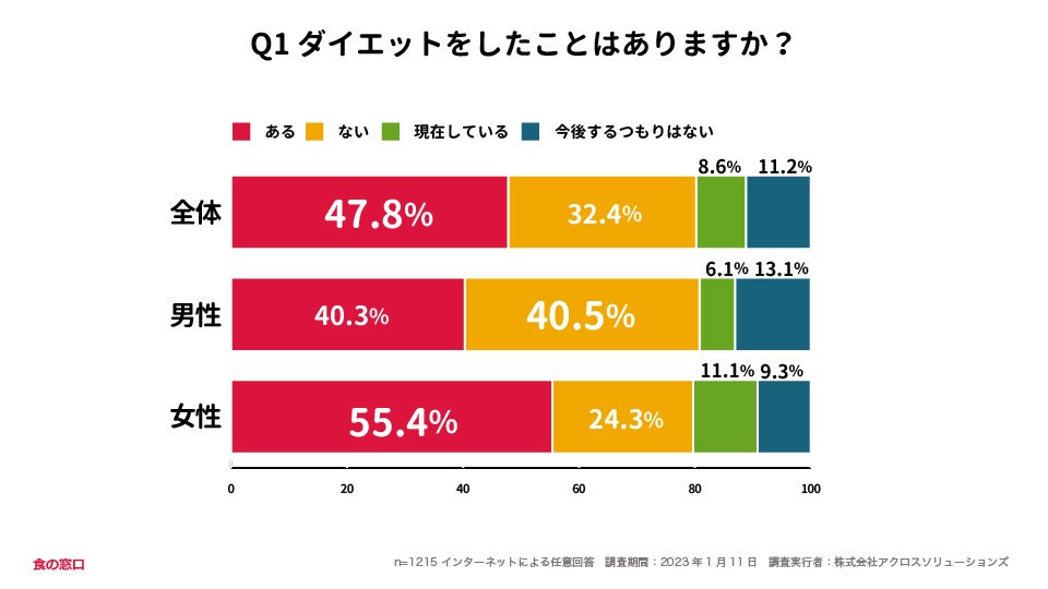 Q1 女性のうち過半数以上の55.4%が「ダイエットをしたことがある」と解答し「ない」に大きく差をつけたが、男性は「ない」と解答した人が「ある」と解答した人を上回った。