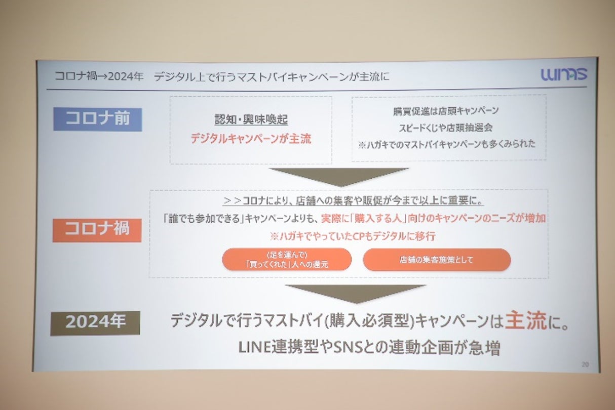 講演では、冒頭でWEB/SNSを使ったキャンペーン手法についてお話した後、これまでにウィナスで蓄積されたキャンペーンデータを用いて、コロナ前後と現在の販促・マーケティングの傾向として、キャンペーン手法やキャンペーン企画における傾向についてお話させていただきました。