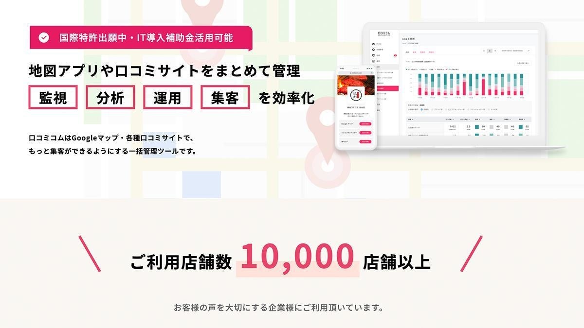 株式会社movが提供する口コミコムは、Googleマップをはじめとした地図アプリや口コミサイトでの店舗情報を整理し一括更新できると同時に、口コミをAI解析して店舗の問題点を把握し業務改善に活かすことができる、お客様の声を業務改善に繋げられるDXサービスです。