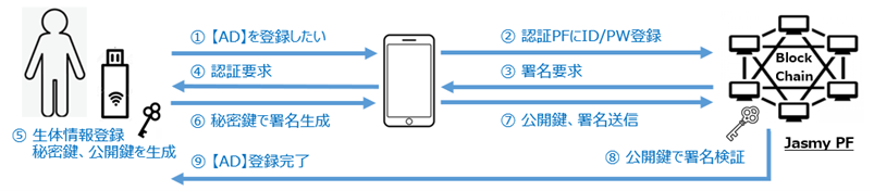 本認証ソリューションを利用するスマートフォンアプリもしくはデバイス(以下、【AD】:Authentication Device)を指定し、当社が提供するPDLを含むブロックチェーンプラットフォーム(以下、認証PF)に、【AD】の情報および各種サービスに利用するID・パスワード情報を登録します。その際に、安全なパスワードを自動生成することが可能になります。また、【AD】 と認証PF の間は、特許を用いた鍵生成方式を利用し、公開鍵方式の安全なやり取りを実現します。
