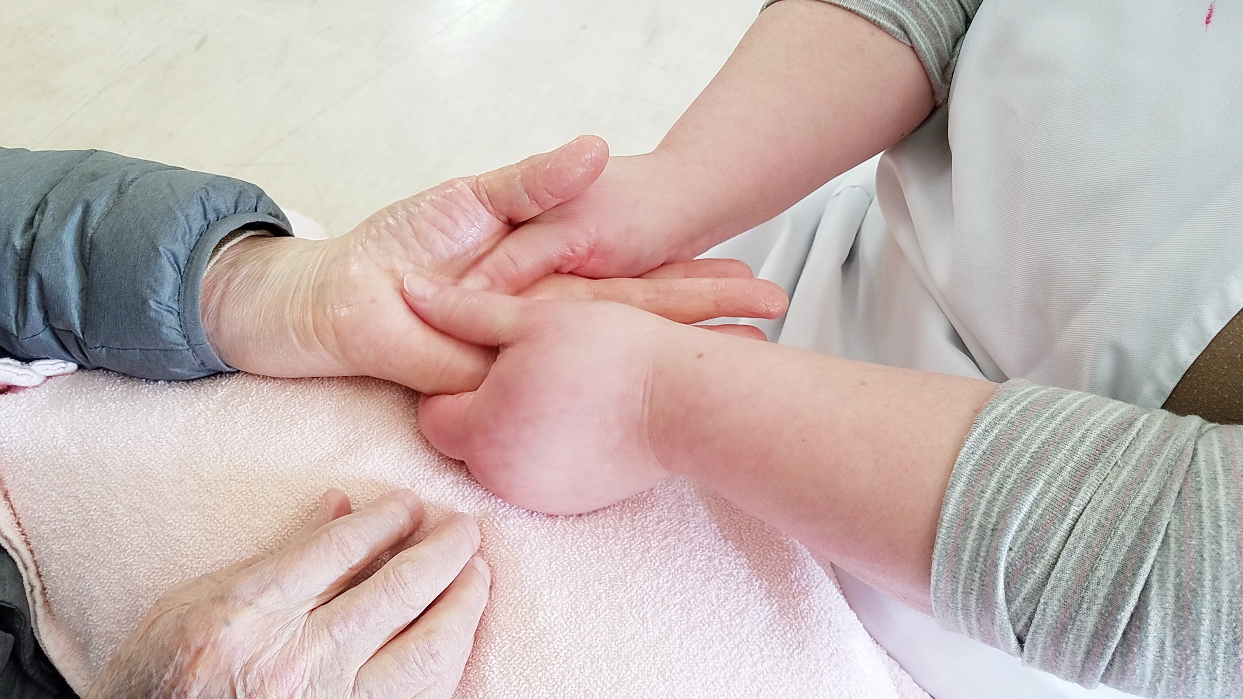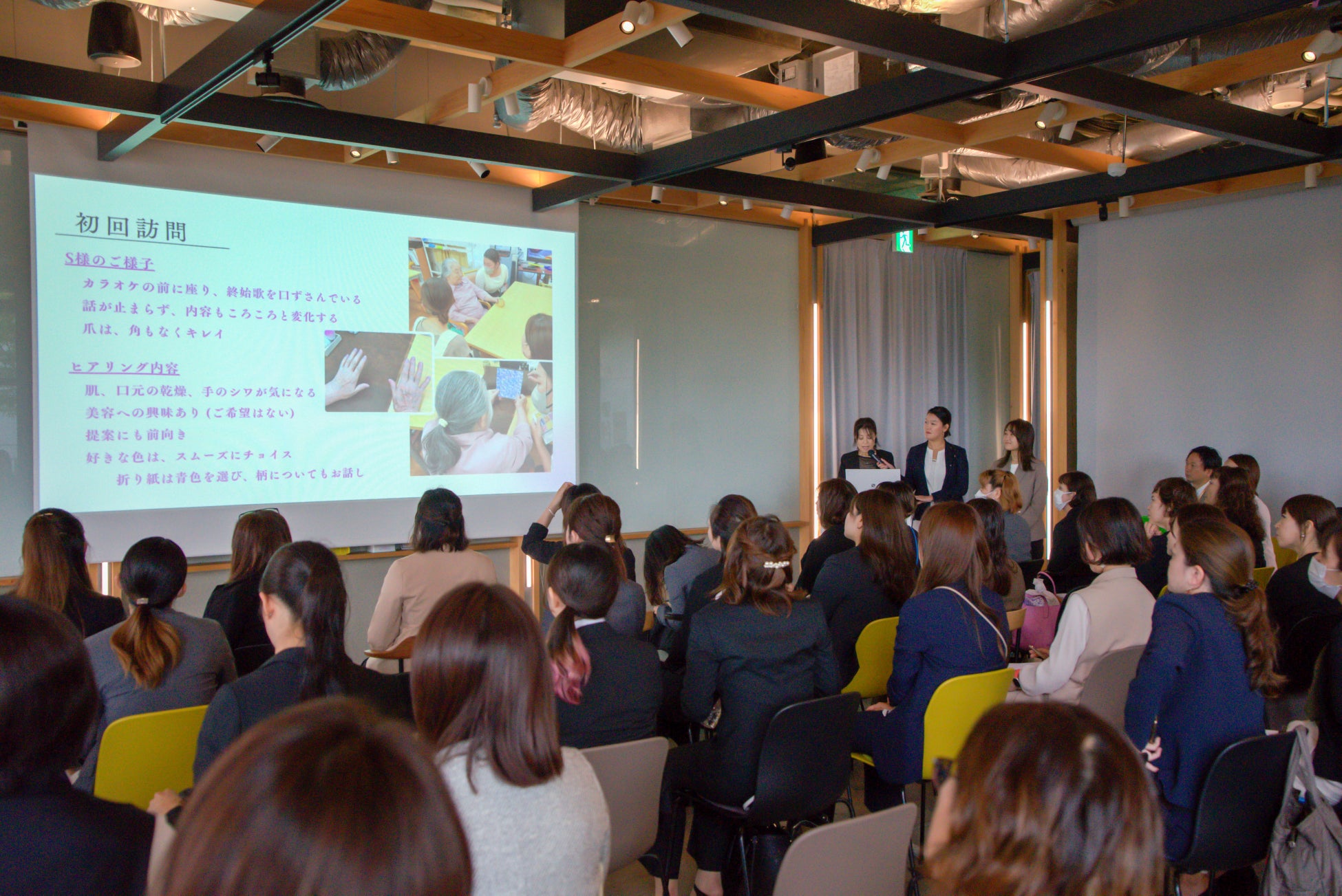 以前の発表会で報告された事例の一つに、要介護2の88歳女性へのアプローチがあります。 初回は「年寄りだから…」と消極的だった彼女に対し、ハンドトリートメントを継続。 2回目には「(前回を)思い出した」と安心した表情を見せ、最終的には「気持ちがいい。ツヤツヤになった」と自ら前向きな発言があり、追加でフェイシャルトリートメントを希望されるほどに、心身の変容が見られました。