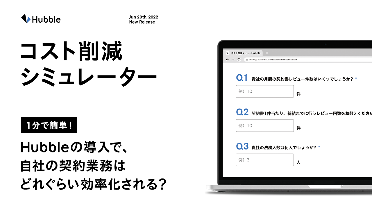 契約業務クラウドサービス「Hubble」を提供する株式会社Hubble(東京都港区、CEO:早川晋平、以下「Hubble社」)は、簡単な情報入力を行うだけで、「自社の契約業務がどれだけ効率化されるか?コストがどれくらい削減できるか?」をシミュレーションすることができる「コスト削減シミュレーター」を公開しました。