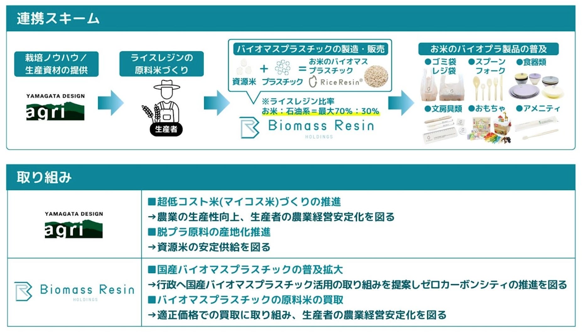YDのグループ会社であるヤマガタデザインアグリ株式会社(本社:山形県鶴岡市 代表取締役:山中大介、以下「YDA」)は、生産者の所得向上に向けてお米の省力・低環境負荷な栽培技術である「マイコス米」の栽培に必要な生産資材の開発販売、ノウハウの提供によって産地化を推進してきました。今回の協定で、YDAは、BRHD社に対してお米のバイオマスプラスチック「ライスレジン」の原料米を安定供給することで事業成長を促進するとともに、生産者の生産効率を上げ、販路確保までサポートすることで、農業経営の安定化にも繋げて参ります。