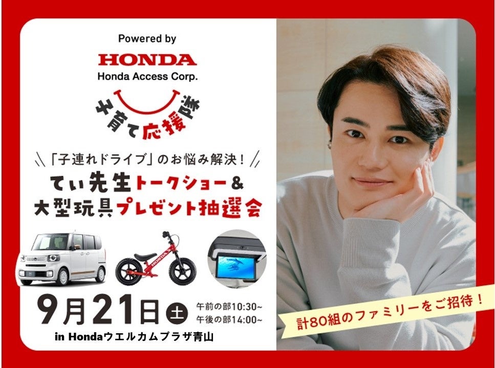 株式会社ホンダアクセスは、2024年9月21日(土)に子育て期の親子向けのイベント「ホンダアクセス 子育て応援隊スペシャルイベント powered by FQ Kids」をHondaウエルカムプラザ青山にて開催します。初開催となる本イベントでは、親子のためのウェルビーイング教育誌「FQ Kids」とコラボし、「子どもとのクルマでのお出かけをもっとラクに、もっと楽しくする」をテーマにトークショーと展示を行います。現役の保育士として働きながら、具体的な育児法を世の中に発信してパパママから支持を得ているてぃ先生をゲストに招いてクルマでの移動を楽しくする役立つアドバイスを参加者の皆さんにお届けします。2024年6月に発売された新型「FREED e:HEV」や子育て期ファミリーに人気のHonda車を展示し、それらのHonda車に2023年ペアレンティングアワードを受賞した子育て応援アクセサリーを装着。子どもと一緒に乗り込んで使い勝手などを確認いただけます。