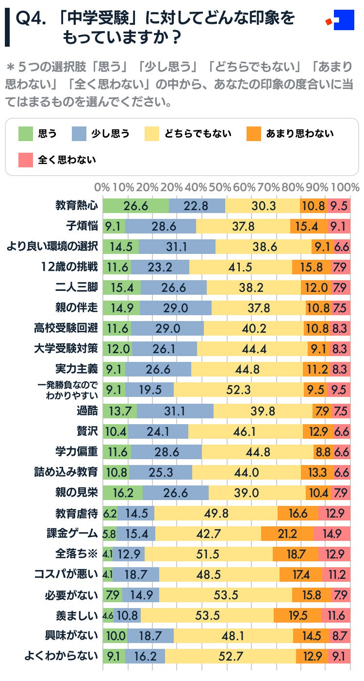 「中学受験」に対する印象については、世間一般で言われるほど、ポジティブでもネガティブでもない実態が見えてきました。