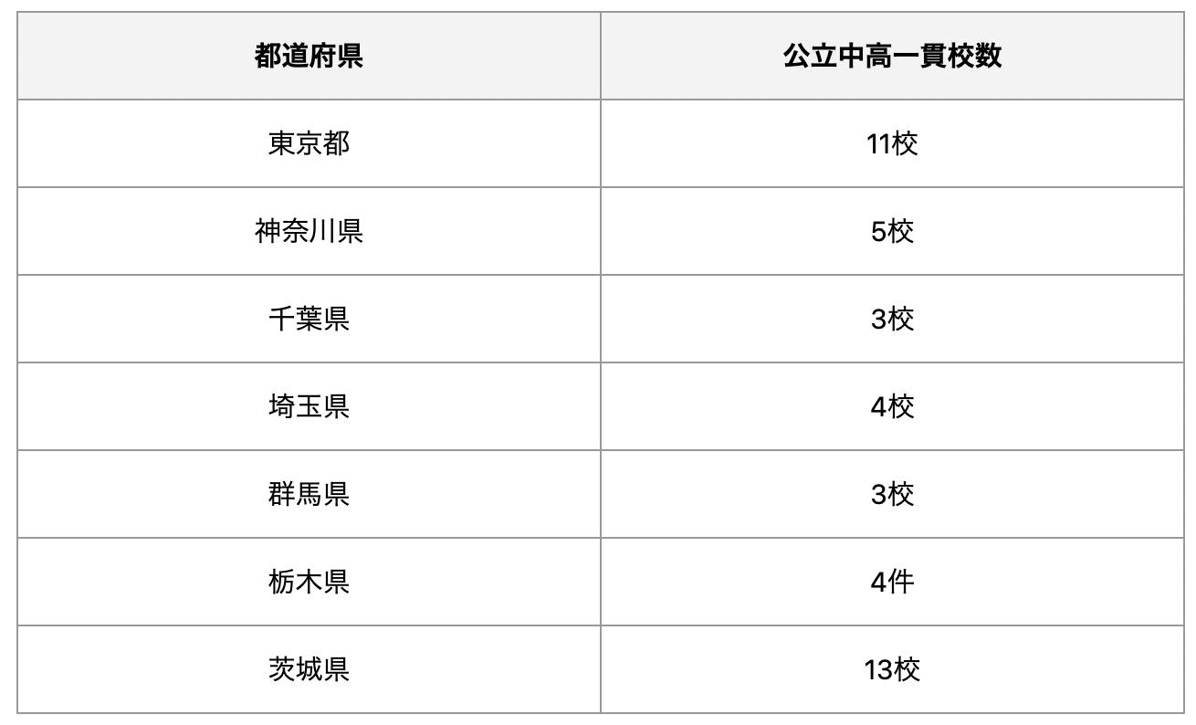 2022年10月現在、首都圏の公立中高一貫校は下記の通りです。茨城県の13校が全国最多となっております。