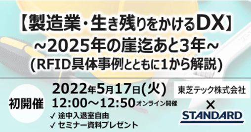 大手企業を中心に600社以上のデジタルトランスフォーメーション(以下「DX」)の推進と内製化を支援する株式会社STANDARD(本社:東京都千代田区、代表取締役社長:櫛野恭生、以下「当社」)は、東芝テック株式会社(本社:東京都品川区、代表取締役社長:錦織弘信、以下「東芝テック」)と2022年5月17日(火)にオンラインセミナー「【製造業・生き残りをかけるDX】~2025年の崖迄あと3年~(RFID具体事例とともに1から解説)」を開催いたします。