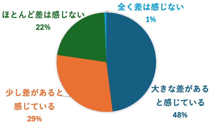年収の違いにより、子供に提供することができる体験機会に大きな差が出てくると回答した人は全体の約5割、少し差があると感じた人は約3割でした。8割の人が年収が子供の体験機会に影響を与えていると感じているようです。