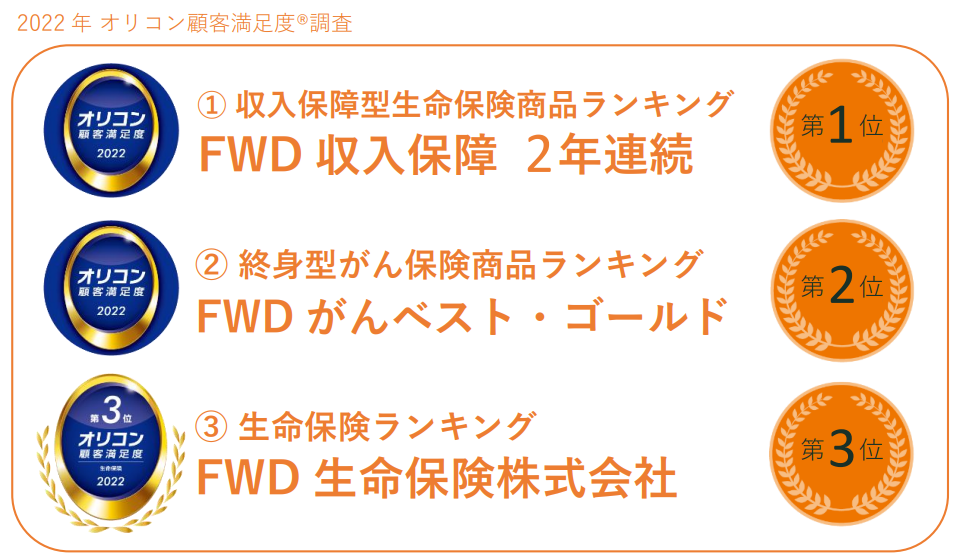 FWD生命、2022年 オリコン顧客満足度調査において、『FWD収入保障』が1位、『FWDがんベスト・ゴールド』が2位、また当社が生命保険会社として3位に選ばれました。