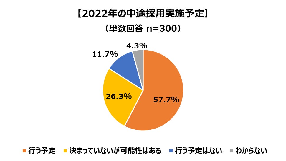 ・2022年に中途採用を行う見込みは「行う予定」57.7%、「決まっていないが可能性はある」26.3%であわせて84.0%。