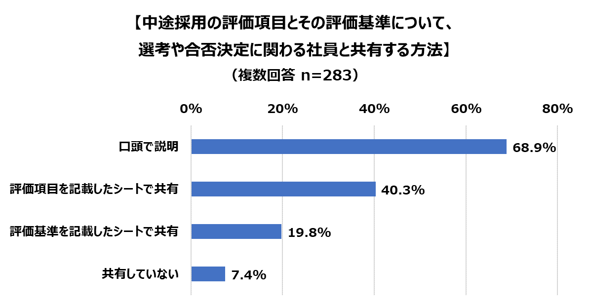 本調査では、68.9%の企業が口頭説明で、応募者の評価項目や評価基準を社内共有していることが分かりました。「口頭説明だから認識がズレる」とは言い切れませんが、やはり、評価項目や評価基準は明文化し、曖昧な表現を極力排除した形で社内共有することが望ましいと考えられます。