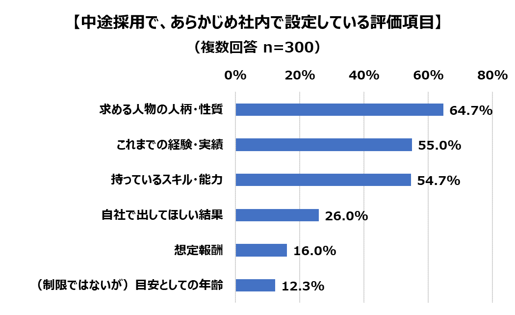 ・中途採用を始める際に、採用したい人物像や雇用条件として社内で設定している評価項目は「求める人物の人柄・性質」64.7%、「これまでの経験・実績」55.0%、「持っているスキル・能力」54.7%が上位に。「自社で出してほしい結果」をあらかじめ設定している企業は26.0%にとどまる。