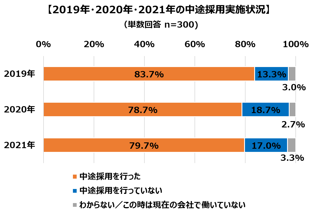 Q1. あなたがお勤めの会社での2019年・2020年・2021年の中途採用実施状況をお答えください。(単数回答、n=300)
