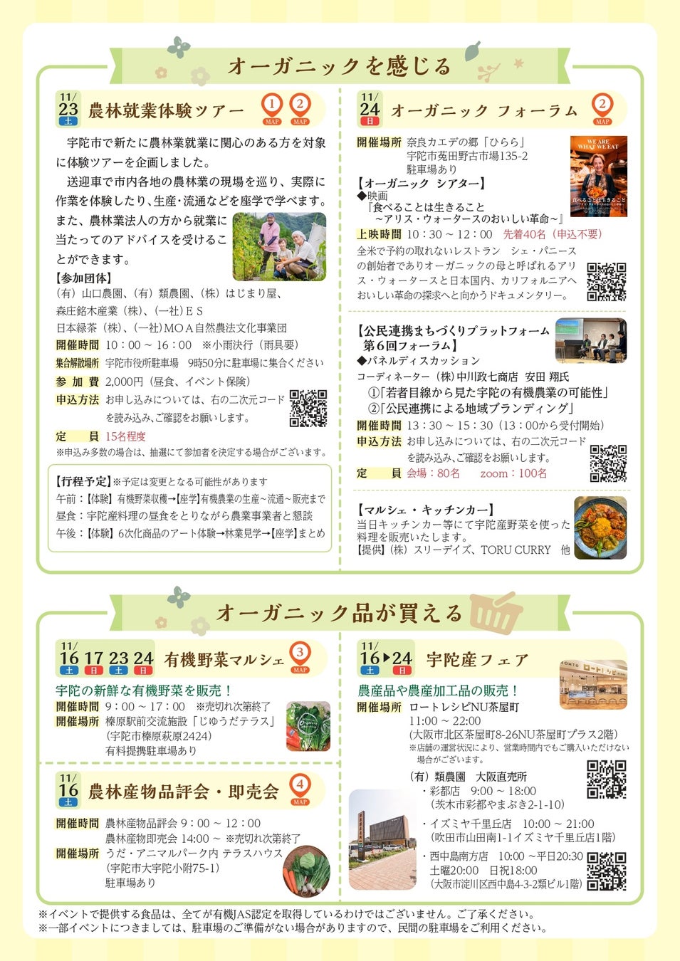 奈良県宇陀市は全国に先駆け、2022年に「オーガニックビレッジ宣言」を行いました。今回開催される農林就業体験やオーガニックフォーラムは、宣言から 2周年を記念したものです。フェスはフォーラムの他、映画を上映する「オーガニックシアター」や有機野菜マルシェ、キッチンカーの販売などが宇陀市で開かれます(11月16日~24日連日、大阪のロートレシピ NU茶屋町にて有機野菜で作った商品の販売も行われます )。