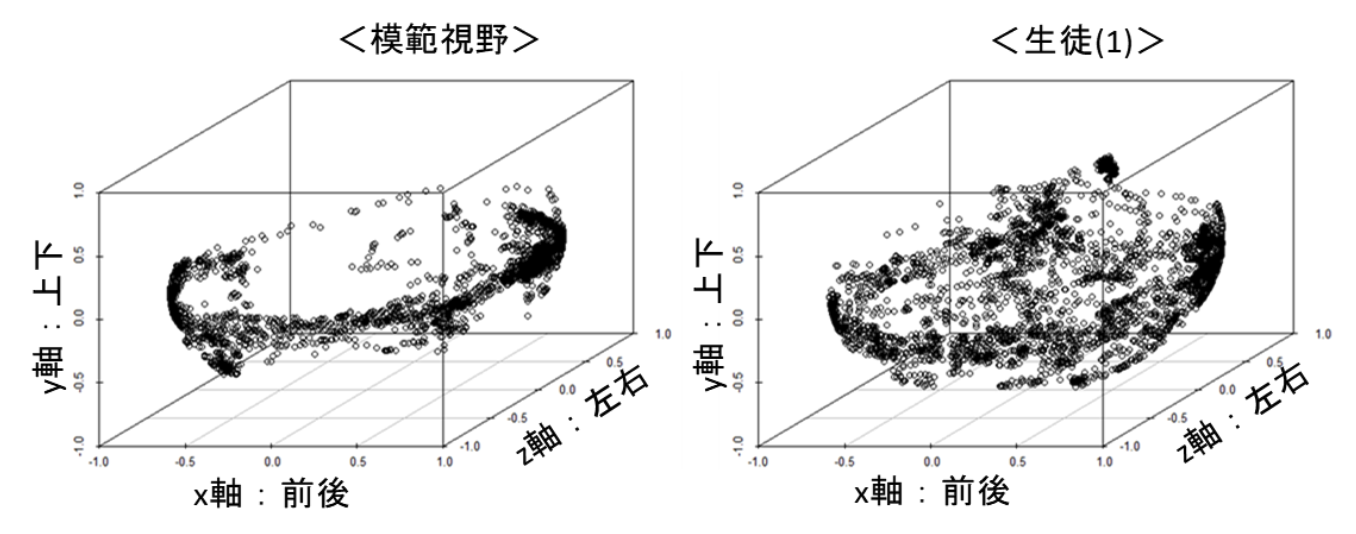図1:模範視野と生徒との視線座標の比較(「令和2~3年度専修学校における先端技術利活用実証研究『スポーツ及び保育人材育成における先端技術を利用した学習成果検証事業』」より)
