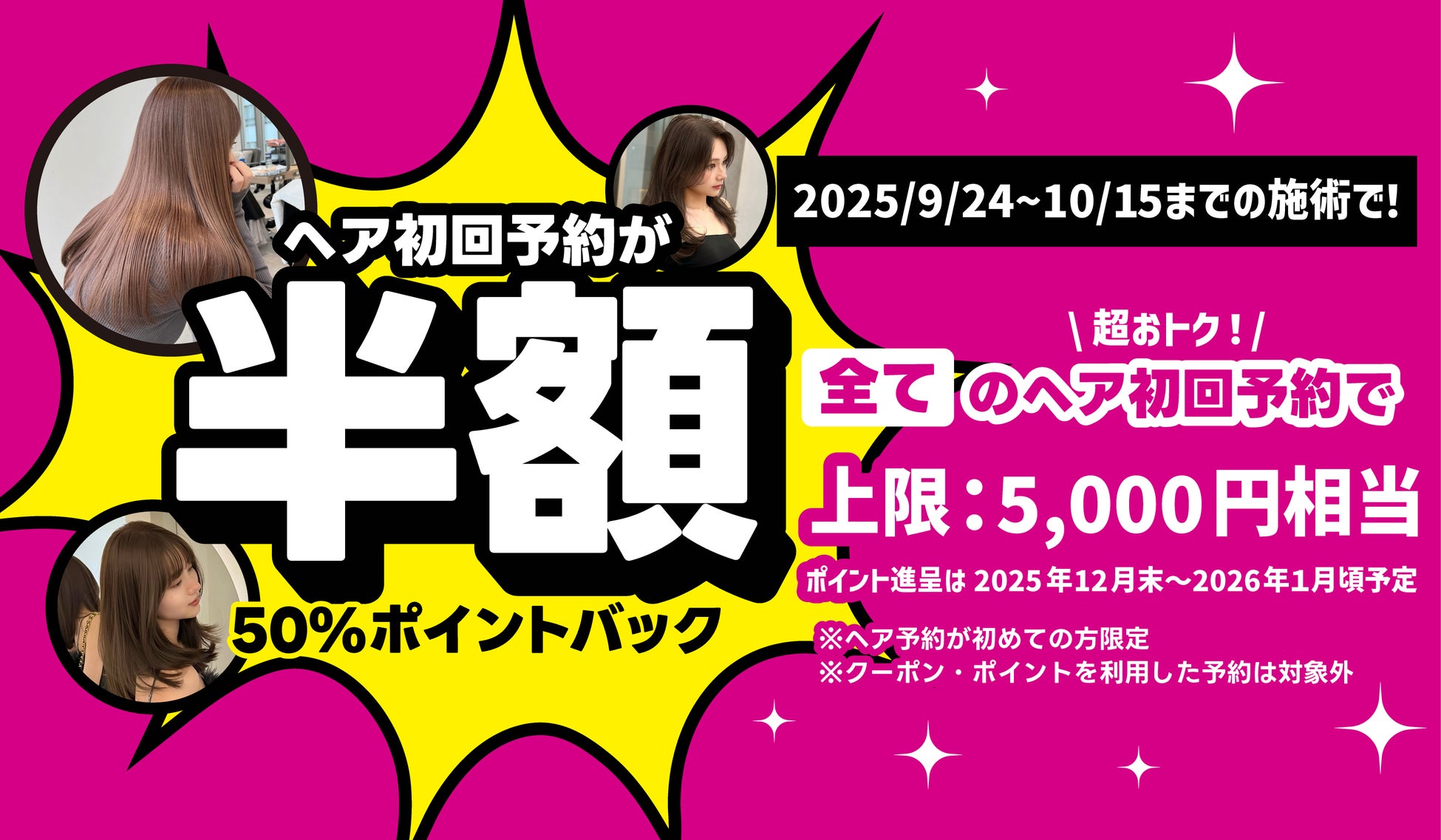 ・内容:対象期間内のヘア予約(施術完了)に対して、決済金額の50%分をポイントで還元