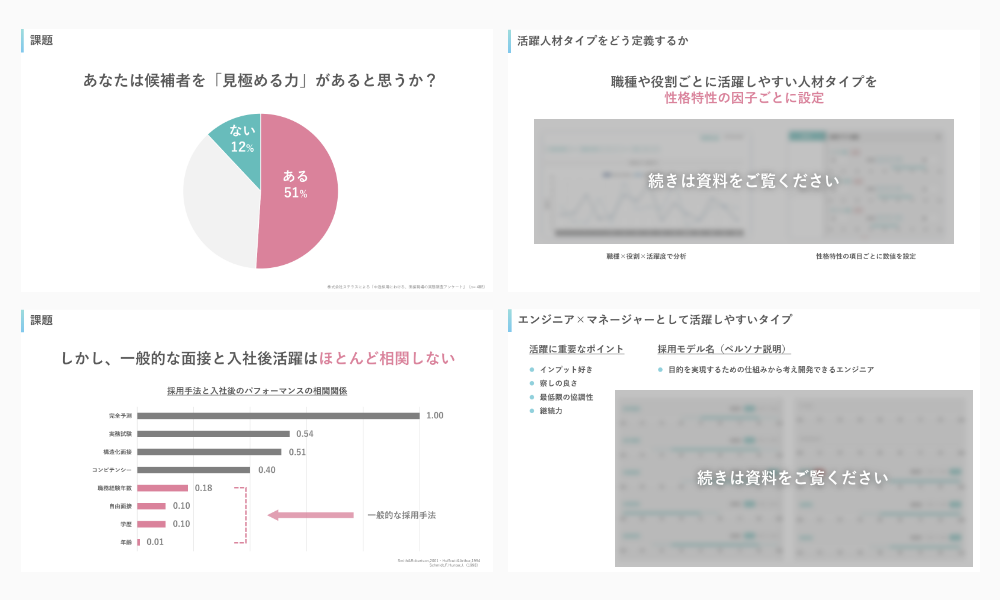 その傾向を用いてどのように自社の採用ペルソナ設計や人事配置に活かすべきかご説明する他、自社のデータや個人の経験則だけでは得られない、定量的なデータ分析による人材採用の新たな視点を提供しています。