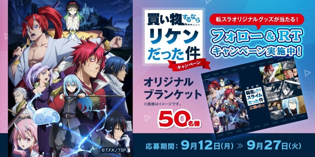 期間中に理研ビタミン公式ツイッター「@rikenvitamin_jp」をフォローし、本キャンペーン対象ツイートをリツイートすると、抽選で50名様に転スラオリジナルグッズをプレゼントいたします。