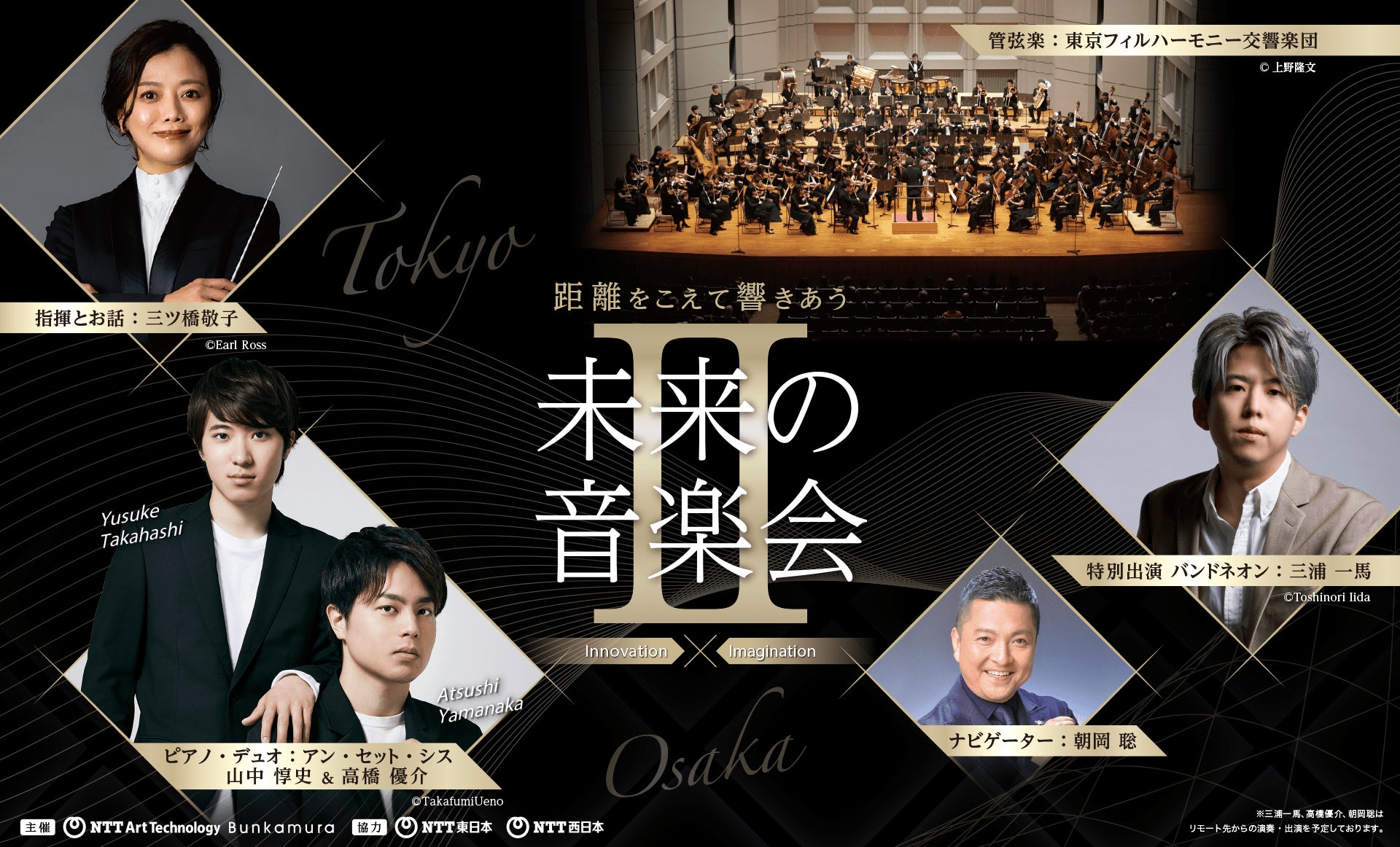 2022年3月に、NTTグループが開発している低遅延通信技術で渋谷と西新宿をつなぎ、通信による時差を感じない“リアルタイム・リモート演奏”に成功した『未来の音楽会』。第二弾となる本公演では、400km離れた東京-大阪に加えて、神奈川・千葉の1都1府2県をつなぎ、一つのハーモニーを奏でます。