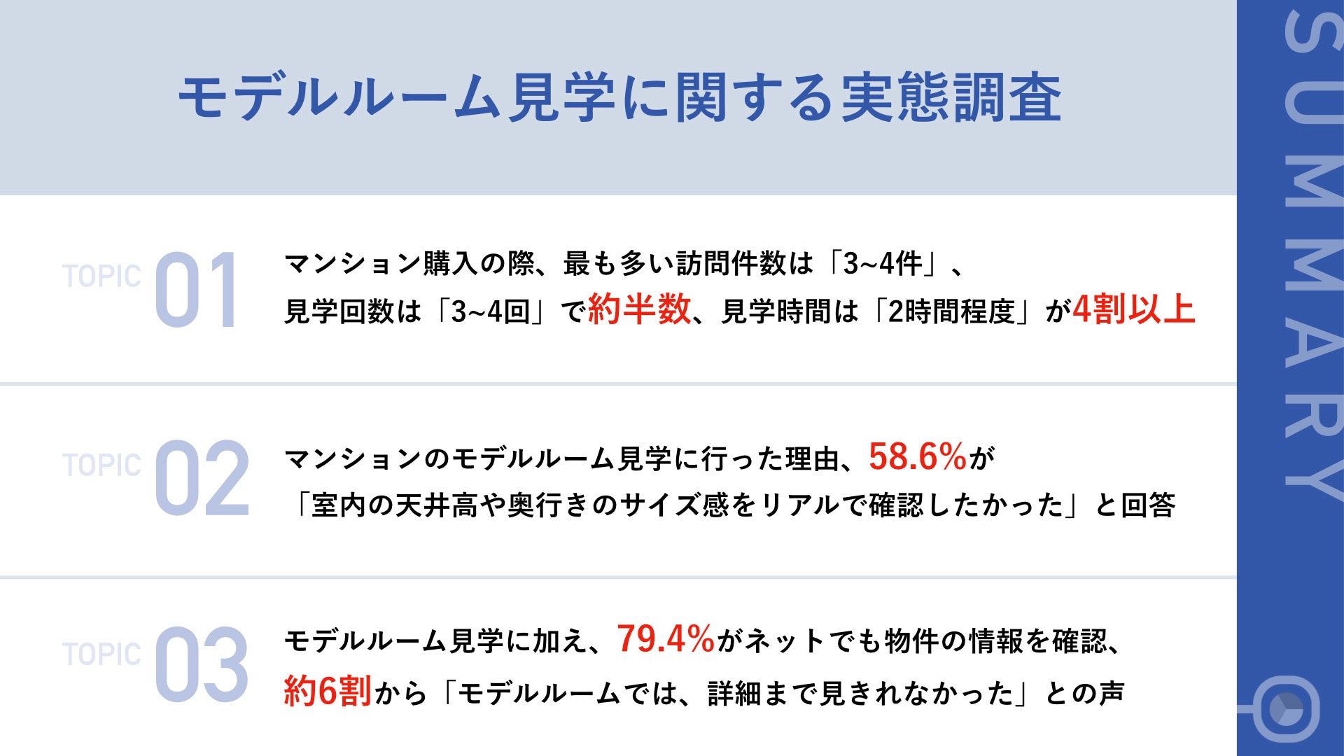 一方で、モデルルーム見学の際に「天井の高さ」や「各部屋の広さ」を家具の配置有無でもっと検証したかったとの声も多く挙がりました。そのためモデルルーム見学に加え、約8割もの人が、インターネット上でさらに詳細な検討している部屋タイプの情報を確認していることがわかりました。