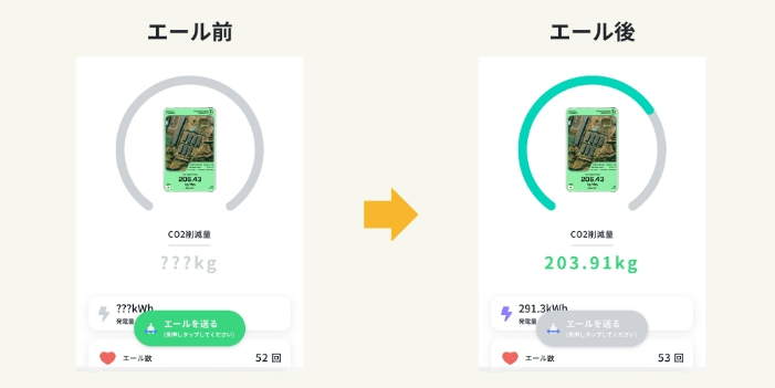 デジタルオーナーとなることで、デジタルコンテンツとして環境貢献の数値を日々確認し、環境貢献を自分ごととして捉えていただく機会を得ることができます。すでに、capture.x内では、2万5000回以上のエールが送られ、デジタルオーナーたちは、日々CO2削減量を確認しています。