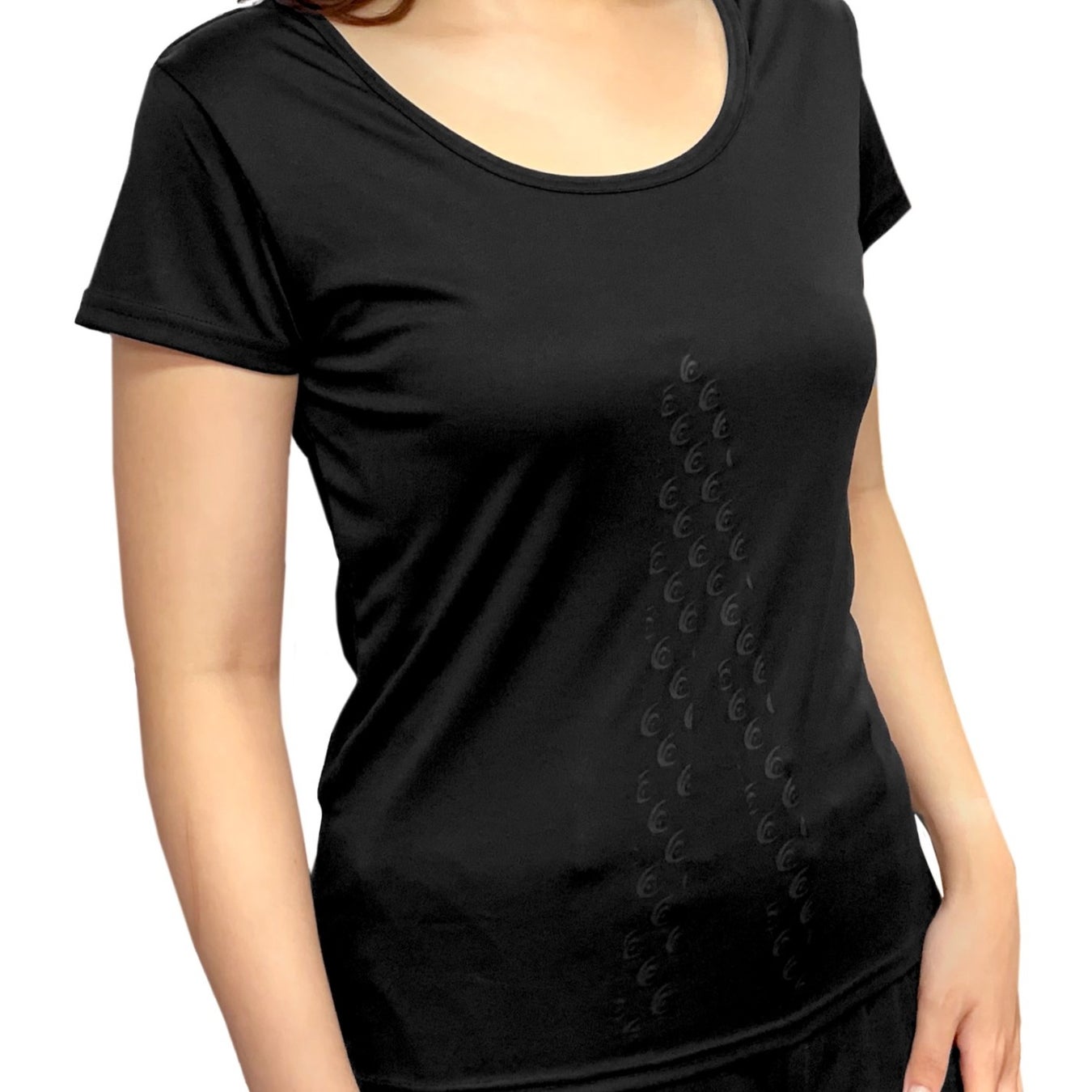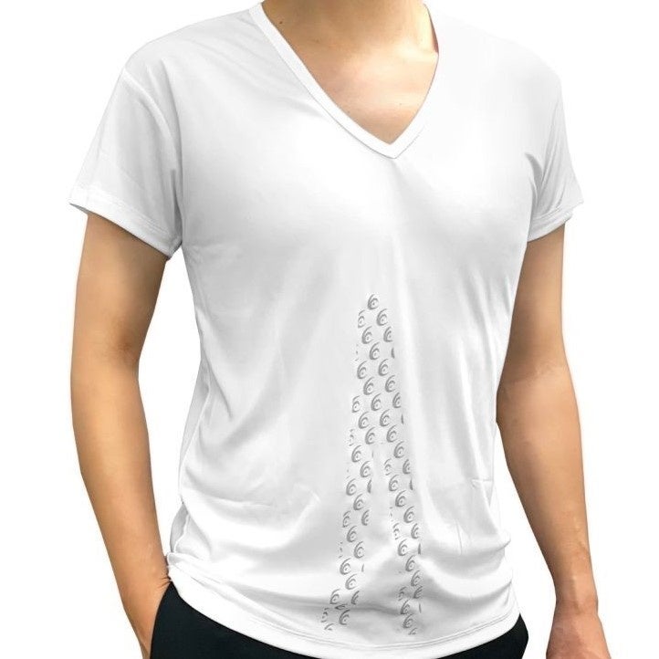 トルマリンなどの鉱石を練り込んだインクがシャツの前面と背面にプリント加工され、そこから輻射される遠赤外線により、着用時に血行が促進される機能性ウェアです。