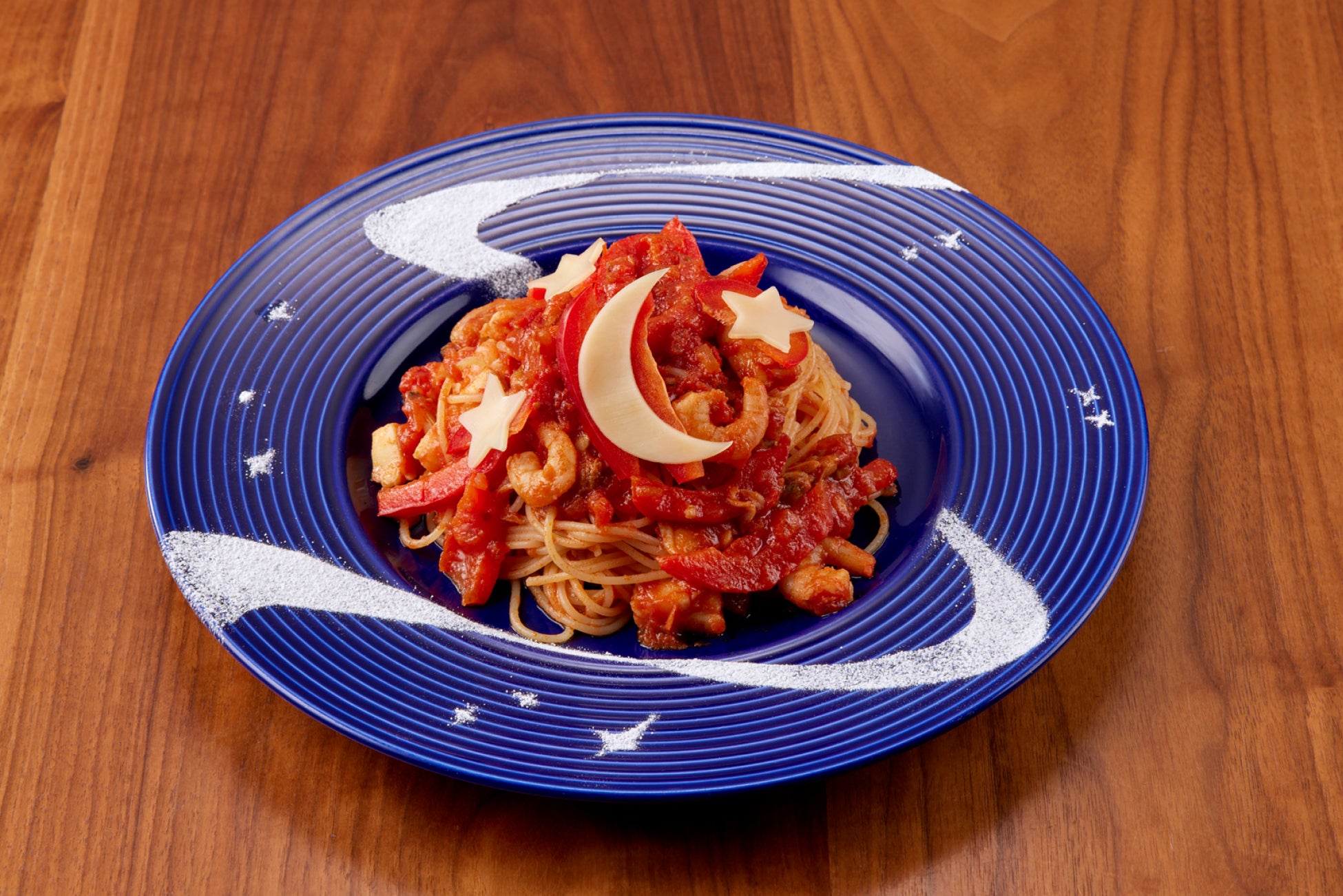 『ファンタジア』にインスパイアされたパスタプレート。魔法使いの弟子であるミッキーマウスのローブの赤をペスカトーレで、帽子を青いお皿で表現し、パスタの上には星型と月型に抜いたチーズを飾りました。