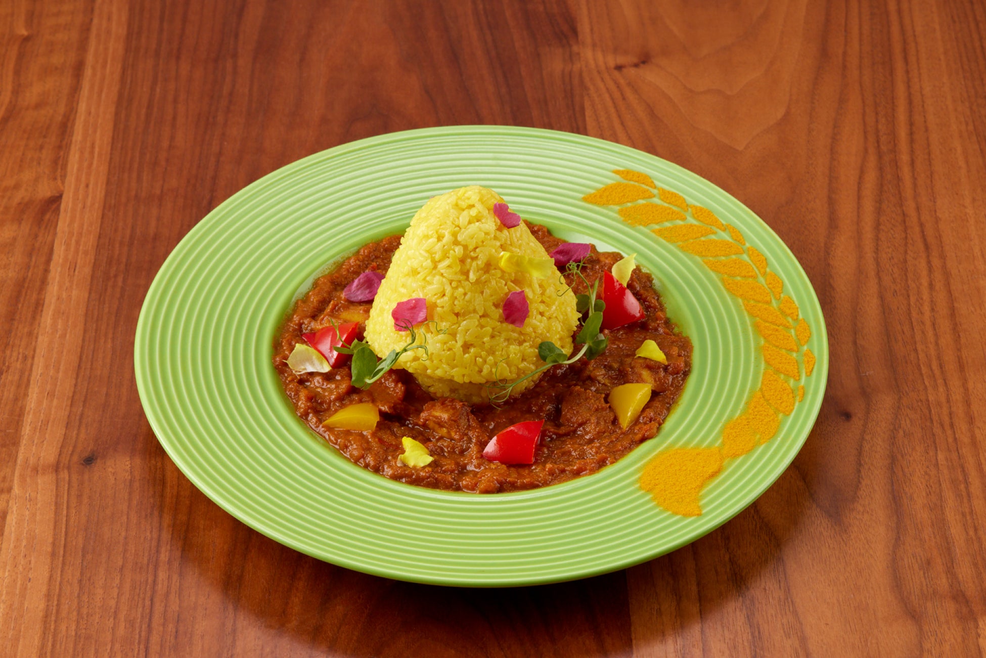『塔の上のラプンツェル』の塔をモチーフに、エディブルフラワーやピーテンドリルを使ったお子様にも食べやすいまろやかなスパイスカレーに仕上げました。
