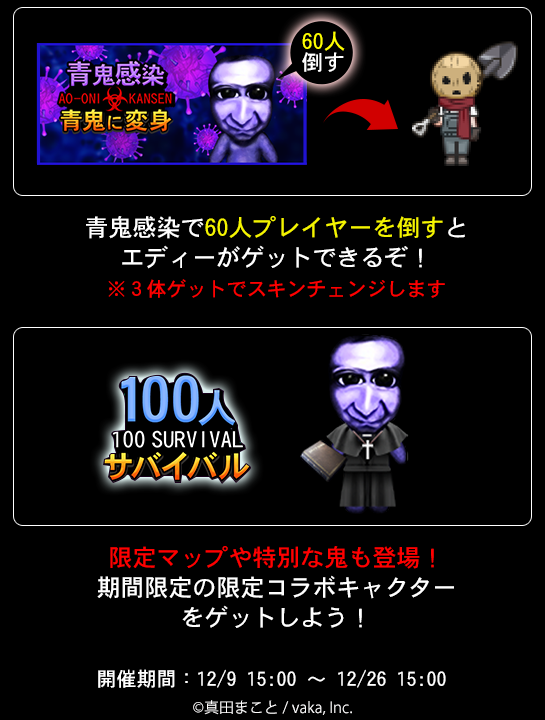 株式会社GOODROID(本社:東京都目黒区、代表取締役社長:松田和彬)は、最大100人のキャラクターが青鬼から逃げ回るマップの中で最後の一人として生き残ることを目指すオンライン・サバイバルゲーム「青鬼オンライン」にて、「殺戮の天使」コラボイベントが12月9日15:00より開始したことをお知らせいたします。