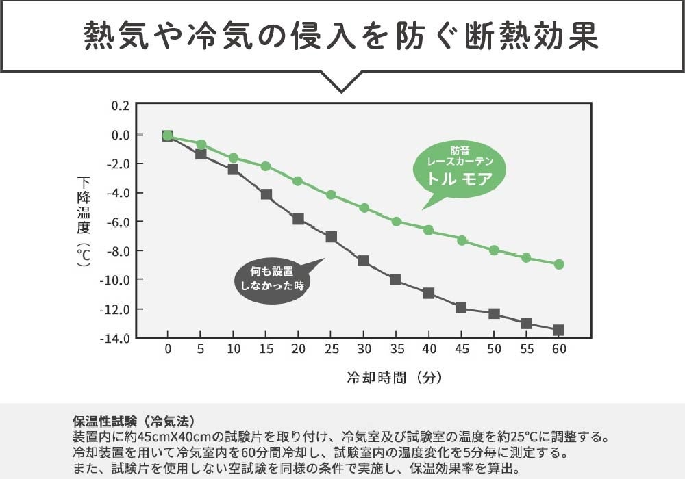 熱気や冷気を通さず、室内の冷房効果や暖房効果を高めます。遮熱の効果率は通常のレースカーテンの最大60%であるため、冷暖房費の節電・省エネ効果があります。