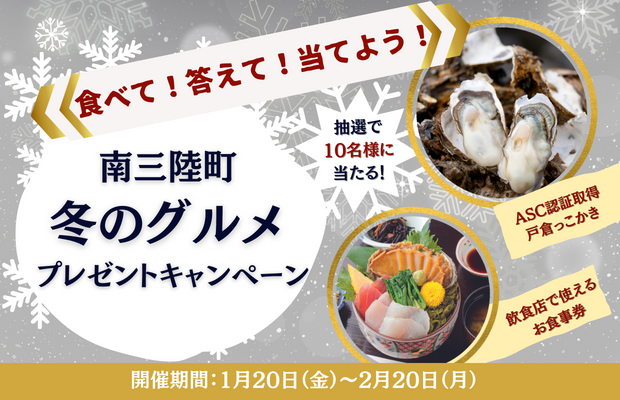 i宮城県にある南三陸町観光協会は、2023年1月20日(金)〜 2月20日(月)の期間、南三陸町内の飲食店(20店舗以上参画)の利用の際に、アンケートに答えるだけで参加できるプレゼントキャンペーンを実施いたします。