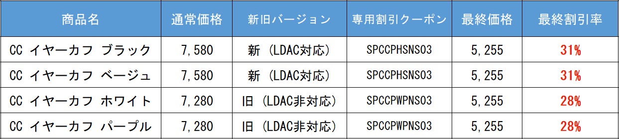 本製品のバージョンアップと日頃のご愛顧に感謝し、7月3日(木)より最大31%OFFの謝恩セールを実施します。カラーによって新旧バージョン(LDAC対応/非対応)と割引率が異なるため、ご注意ください。