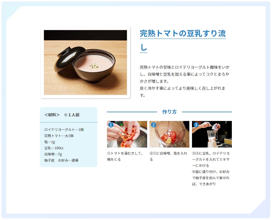 今回のオリジナルレシピでは、『日本料理 縁日』の店主 佐藤 雄一氏に、「ロイテリヨーグルト」のなめらかな味わいを生かしながら、旬の食材であるトマト、鮪、さつま芋を組み合わせた料理を3品考案していただきました。「ロイテリヨーグルト」の良さを生かしつつ、ご家庭でも楽しくお口の健康を意識していただくために、今回は、1.砂糖を使用しない 2.ヨーグルトの熱加工をしない 3.家庭で試しやすい食材・簡単な作り方にする、の3つをポイントとしております。