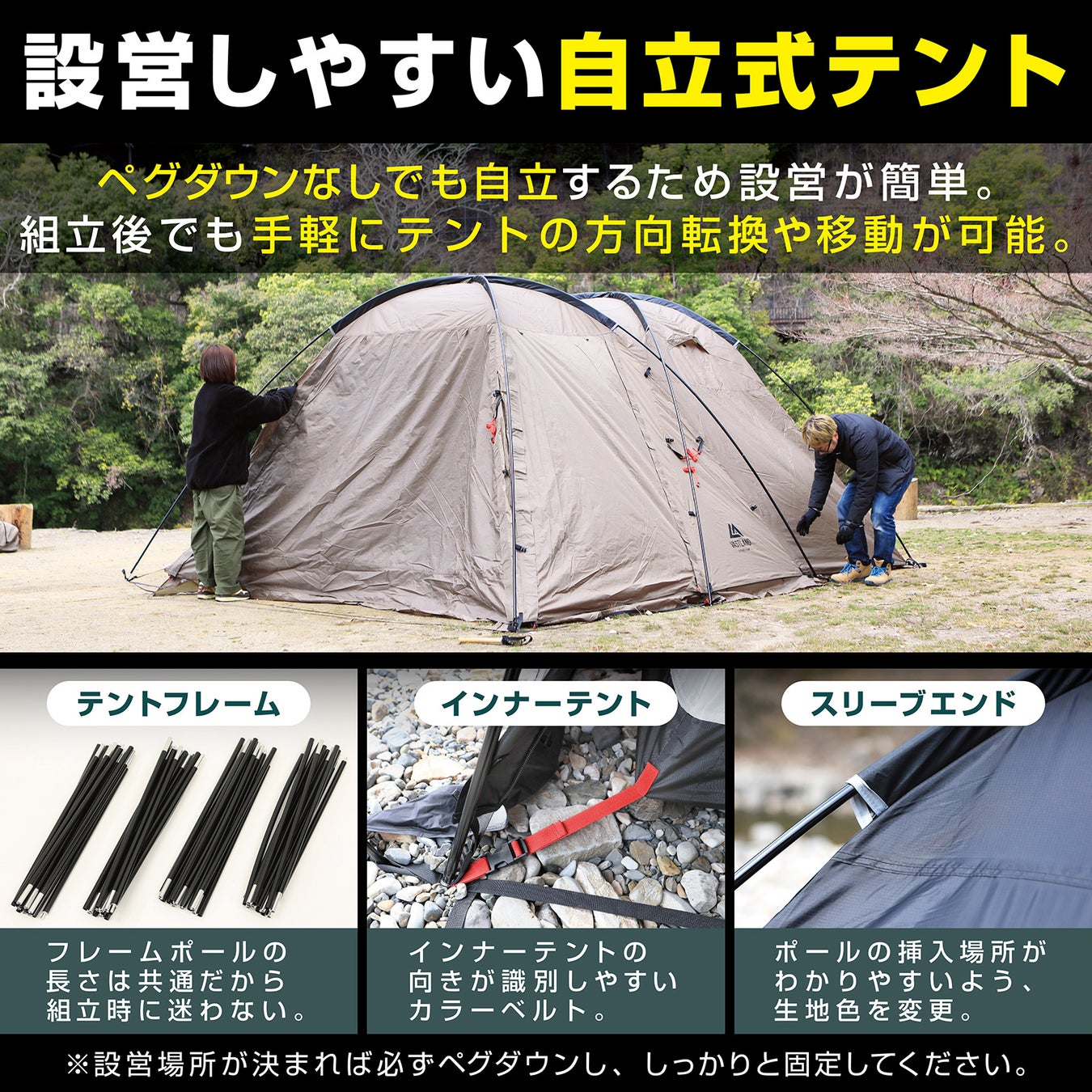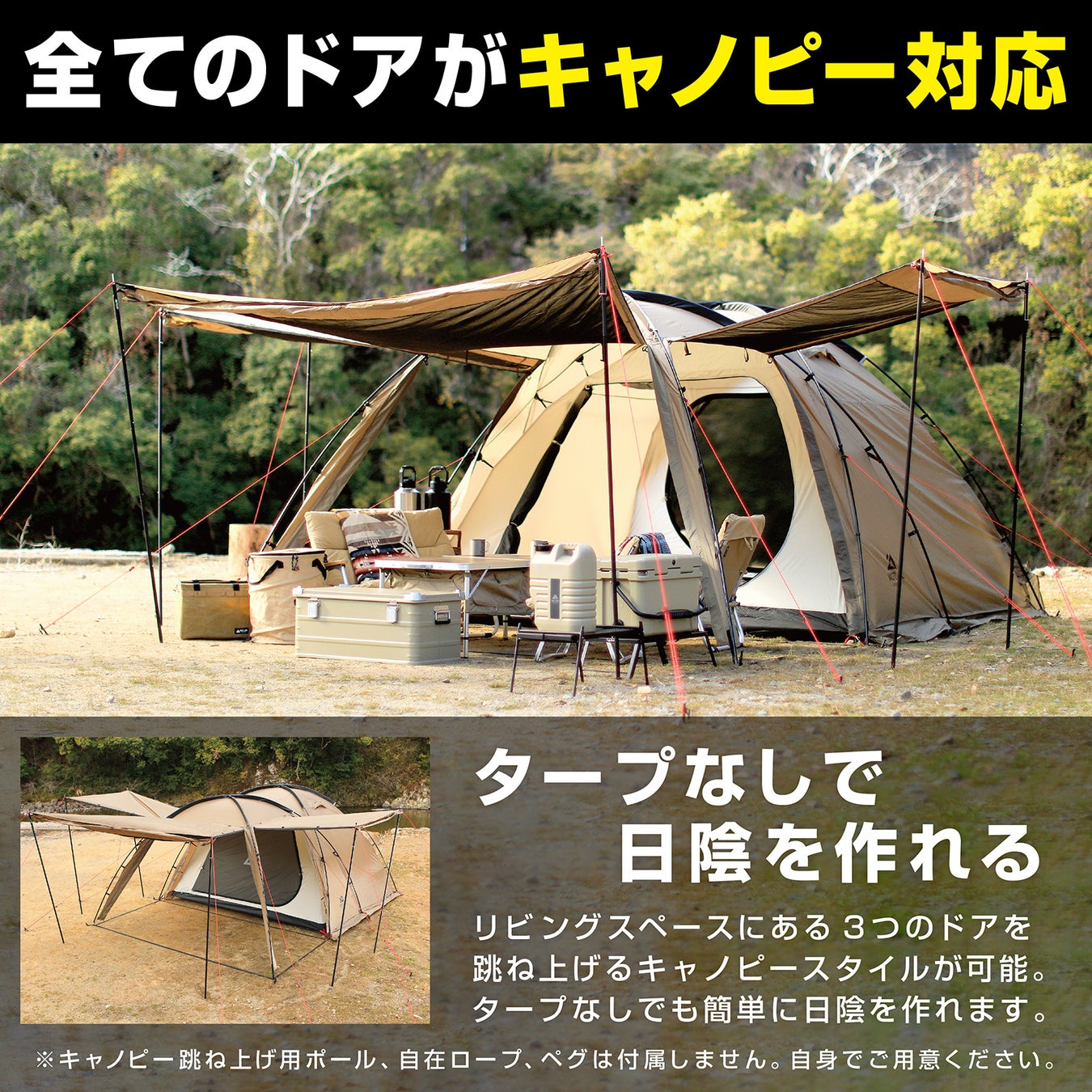 寝室の前に広々としたリビングスペースを備えた2ルームドームテント。前方3方向のドアは跳ね上げられ、タープがなくても広範囲に日陰を作れます(キャノピーポールが別途必要)。インナーテントを取り外せばシェルターテントとしても利用でき、マルチに活躍します。テントはペグダウンなしでも自立し、設営後も簡単にテントの方向転換や移動ができるので、ビギナーでも取り扱いやすいテントです。居住性が高く自由度の高いアレンジに対応。大型のベンチレーションや巻き上げが可能なスカートなどを備えたオールシーズンモデル。デュオやファミリーのキャンプデビューにおすすめです。