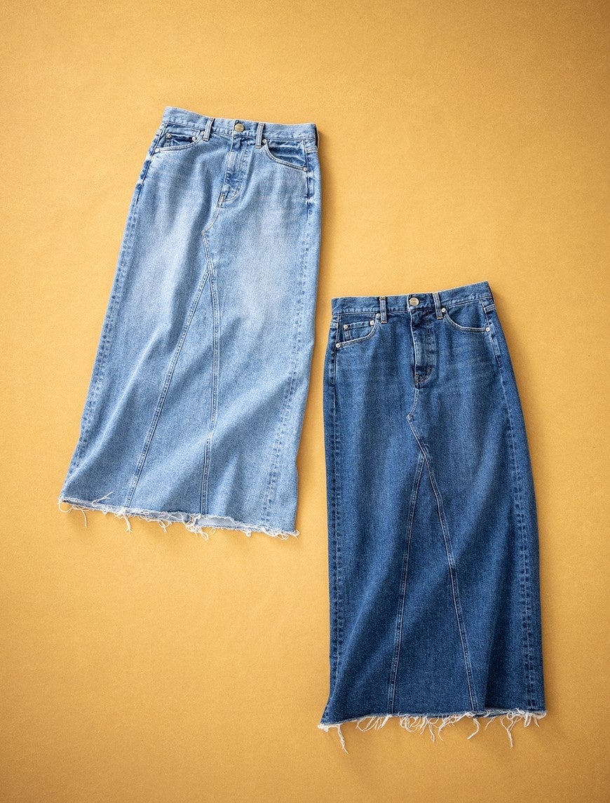 ヴィンテージデニムのような裾のカッティングがポイントのIラインスカートです。