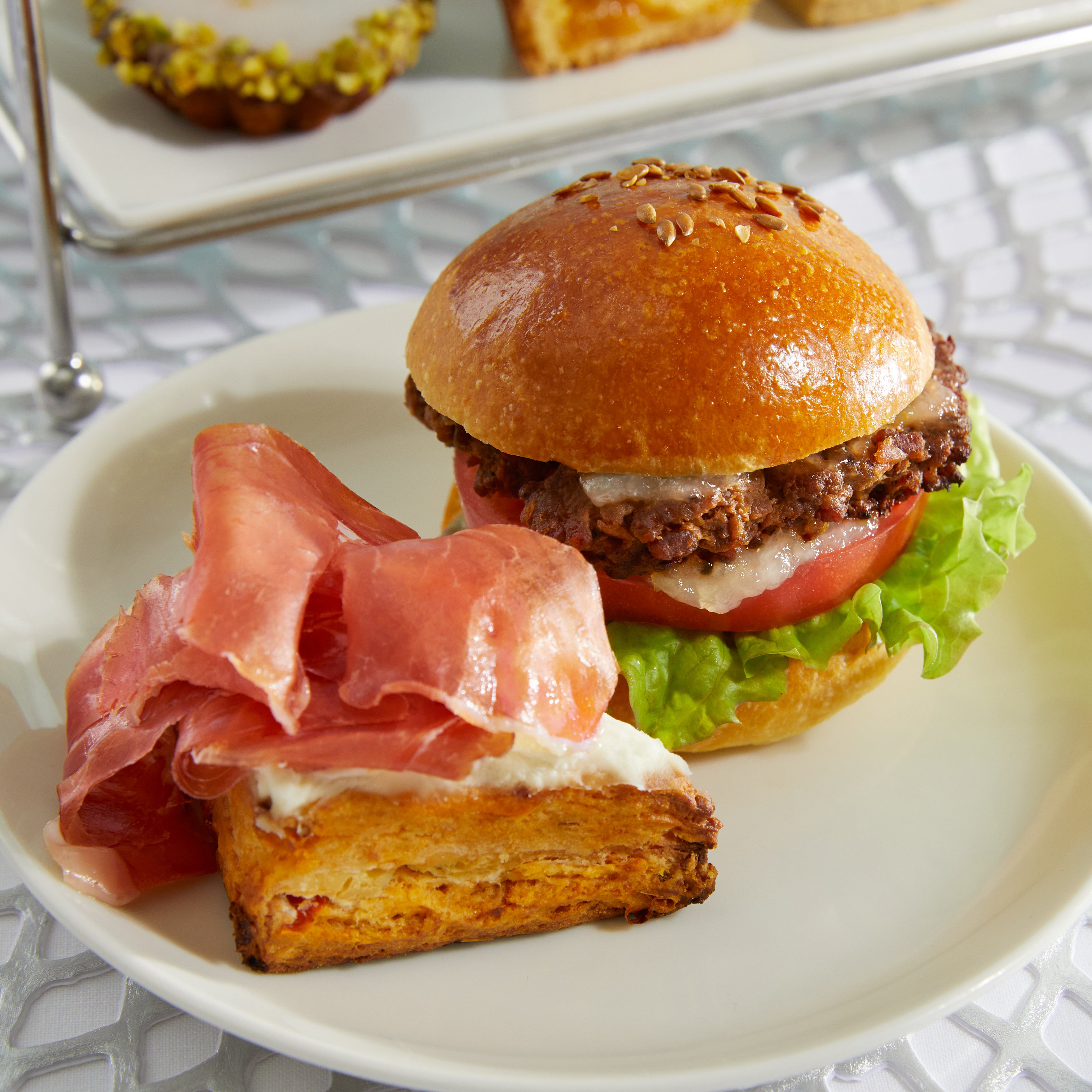 発売するたびにご好評をいただいているイタリアンベーカリー プリンチ®とTEAVANA™ のコラボレーション『ロースタリー パスティッチーニ フライト』が夏らしい装いになって新登場します。イタリア語で「小さなお菓子」を意味する「パスティッチーニ」。本商品では、プリンチ®のシェフの手で一つ一つ丁寧に仕上げられた、見た目にもかわいらしい一口サイズのケーキや焼き菓子8種と、小さなバーガーなどのセイボリー2種の全10種が並びます。レモンを使った爽やかな『トルタ リモーネ』と『トルタ リモーネ & ピスタチオ』、初夏ならではの白桃とアールグレイが香る『バターサンド ティー & ぺスカビアンカ』など、この時期ならではの味わいをお楽しみいただけます。