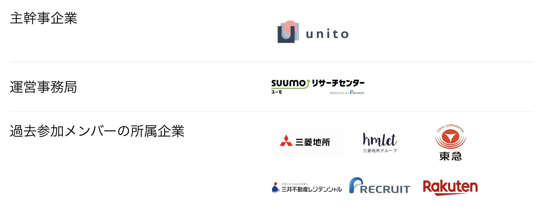主幹企業はUnitoが務め、理念に共感するSUUMOリサーチセンター、三井不動産レジデンシャル、東急、楽天LIFULL STAY、三菱地所、Hmlet Japanなどから、住宅の企画開発や不動産DX/IoTに関心の高い若手有志を中心に研究会へ出席いただいています。