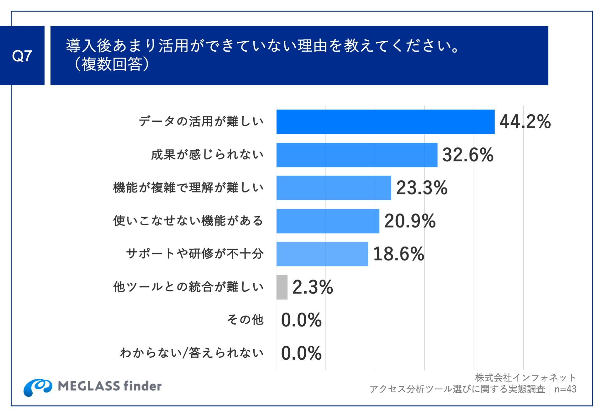 Q5で「あまり活用できていない」「全く活用できていない」と回答した方に、「Q7.導入後あまり活用ができていない理由を教えてください。(複数回答)」(n=43)と質問したところ、「データの活用が難しい」が44.2%、「成果が感じられない」が32.6%、「機能が複雑で理解が難しい」が23.3%という回答となりました。