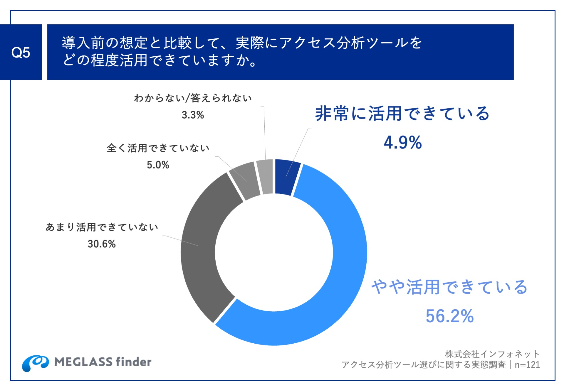 「Q5.導入前の想定と比較して、実際にアクセス分析ツールをどの程度活用できていますか。」(n=121)と質問したところ、「非常に活用できている」が4.9%、「やや活用できている」が56.2%という回答となりました。
