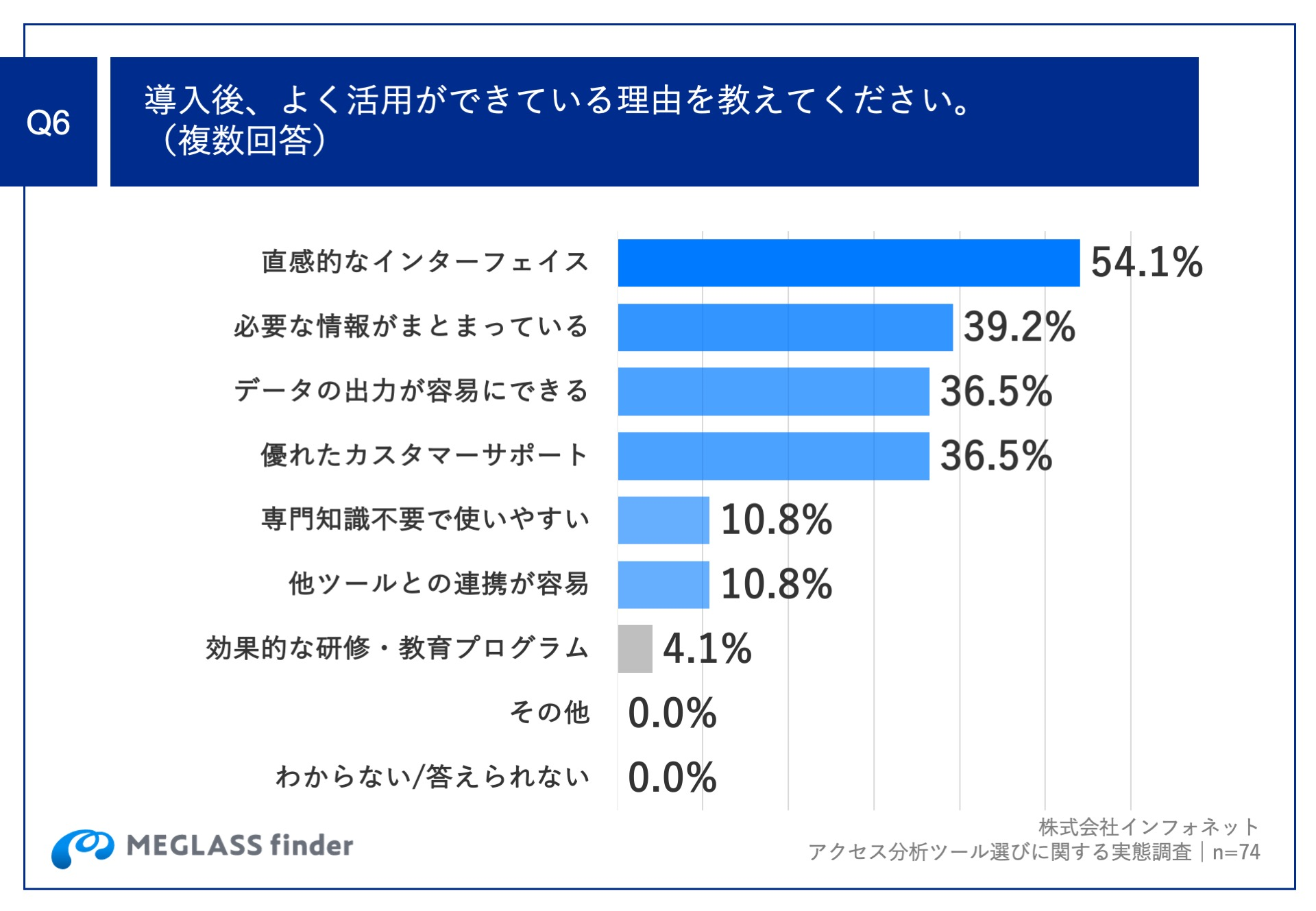 Q5で「非常に活用できている」「やや活用できている」と回答した方に、「Q6.導入後、よく活用ができている理由を教えてください。(複数回答)」(n=74)と質問したところ、「直感的なインターフェイス」が54.1%、「必要な情報がまとまっている」が39.2%という回答となりました。