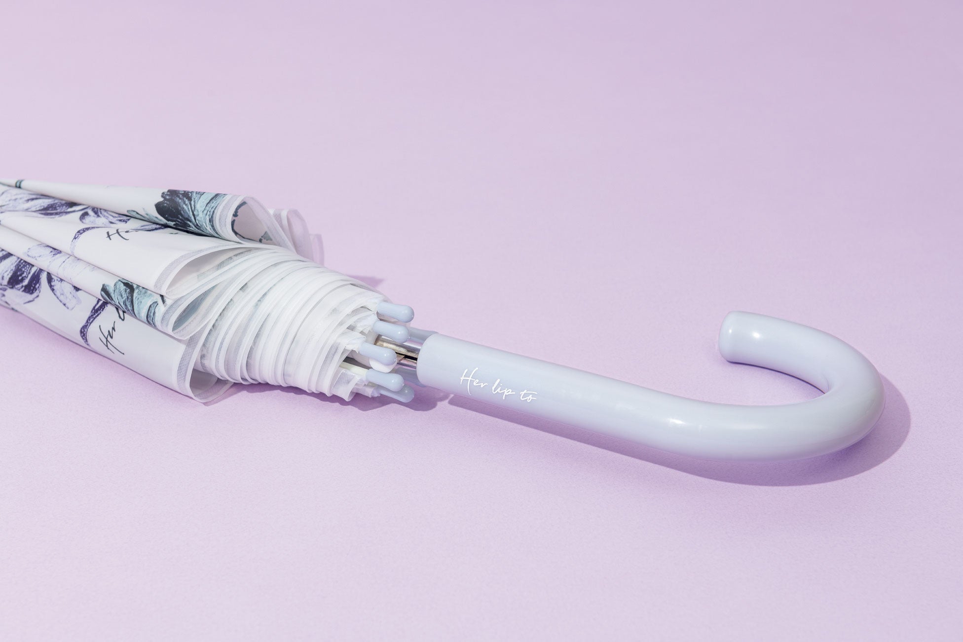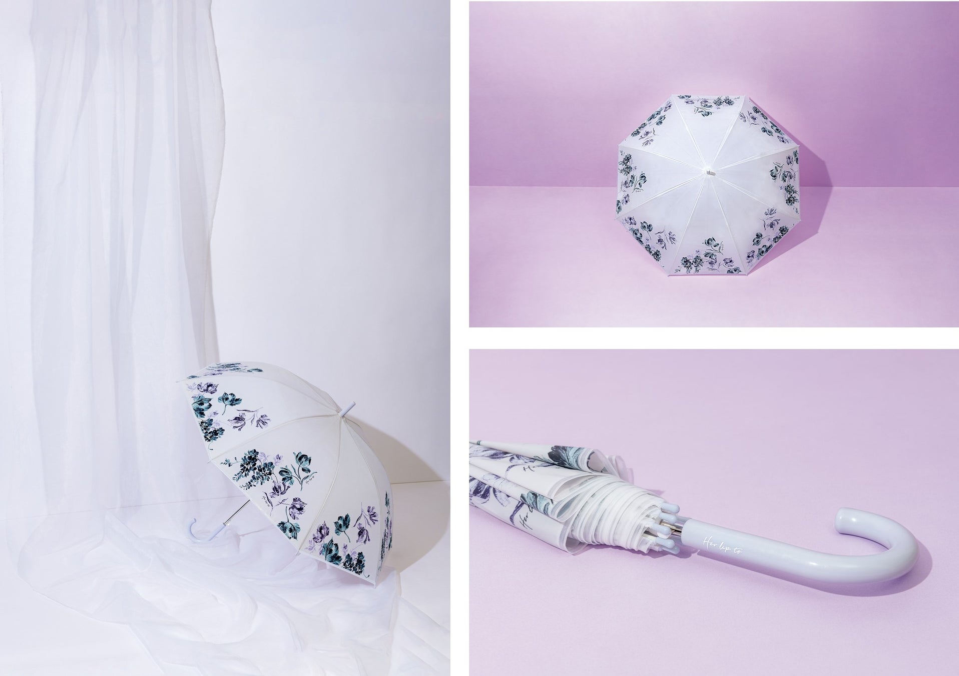 Her lip toファンに発売当初から愛される〝Full Of Love Long Dress〟のオリジナルのフローラルプリントを採用。傘を開くと華やかな柄がパッと広がります♪ セミマット調の素材だから高級感たっぷりで、ビニール傘とは思えないクオリティ! ポイントカラーは「rich lavender」で統一し、持ち手にはブランドロゴをプリントしました。大人レディも品良く持てるデザインの傘で、雨の日の気分も晴れやかに過ごせるはず。