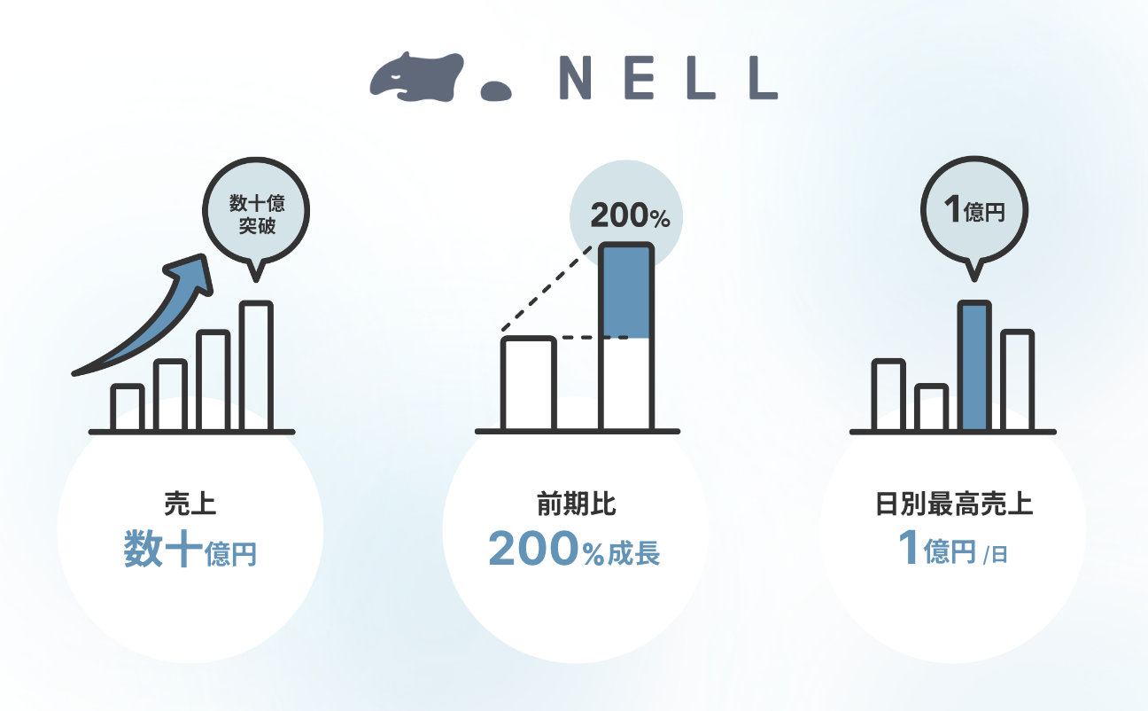 当社の主幹事業である寝具ブランド『NELL』は、2020年10月の事業ローンチ以来、「年間売上高数十億円」を突破、「前期比200%成長」を実現、さらに「日別最高売上1億円」を達成するにまで成長いたしました。