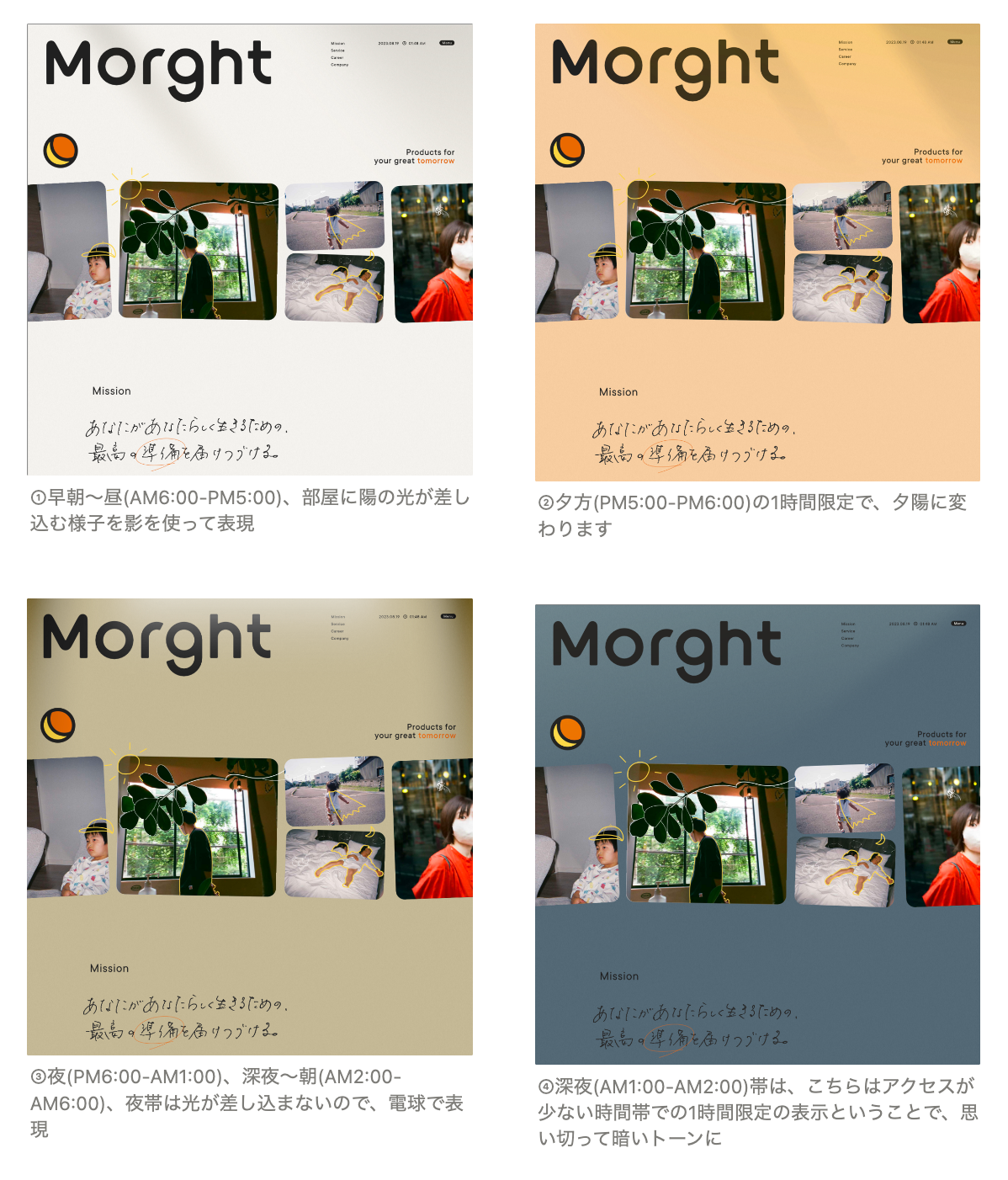 当社の想いと意志、戦略と事業、そして社員とカルチャーを感じていただけるようなサイトデザインを考え抜き、具現化いたしました。また、社名の意味(Morning to Night)を体現するために、アクセスする時間帯によって表情が変わるギミックを実装するなど、多面的に当社のカルチャーを感じて頂けるよう設計しております。当サイトを通して、今後さまざまな方々が当社に興味を持って頂ければと考えています。