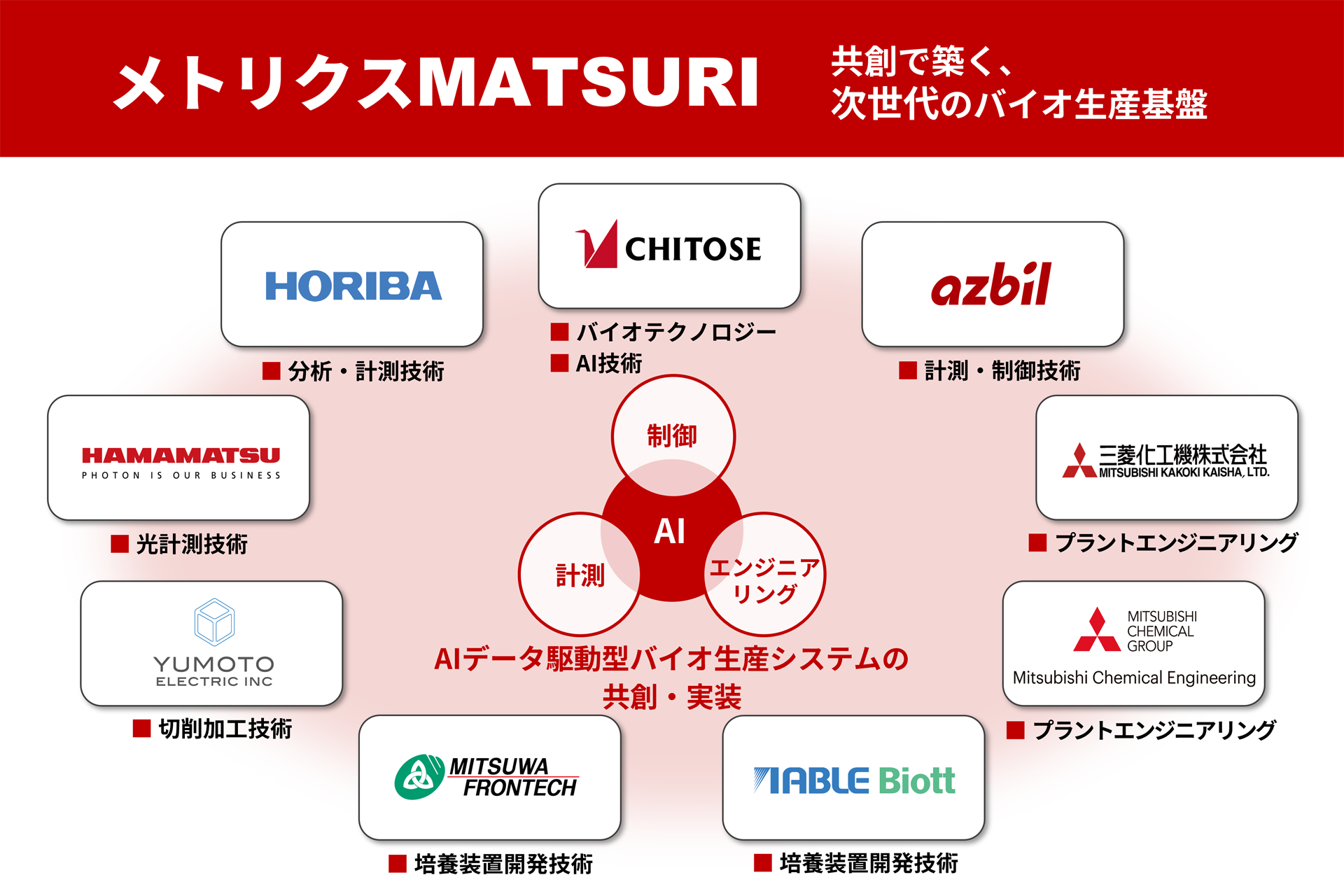 これまでちとせは、個別企業との共同研究を通じてAI自律培養制御技術の開発と実装を進めてきましたが、各社ごとに技術を導入する形では対応範囲やスピードに限界があり、プラント設計や装置開発など周辺領域の専門知識を十分にカバーすることも困難でした。こうした課題を踏まえ、ちとせが運営する産業横断型の共創イニシアチブ「MATSURI」の枠組みを活用し、計測・制御・エンジニアリングなど各分野の企業との連携を強化するとともに、オープンな開発領域を設定することで多様な企業の参画を促すプラットフォームとして「メトリクスMATSURI」を発足しました。