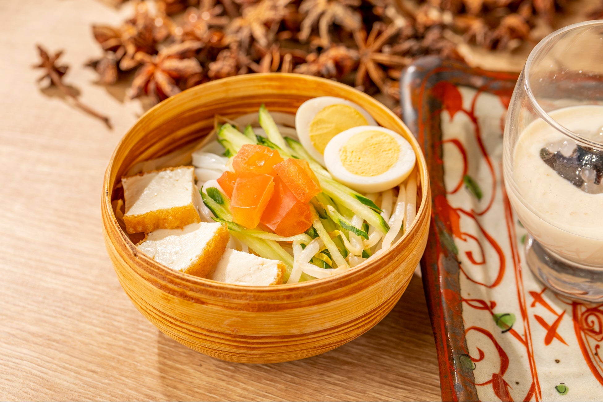 バラエティに富んだ味があり、温かい料理として提供されることが一般的なマレーシア料理ラクサを、冷やして夏仕様に仕上げました。辛味とコクのある創作麺。