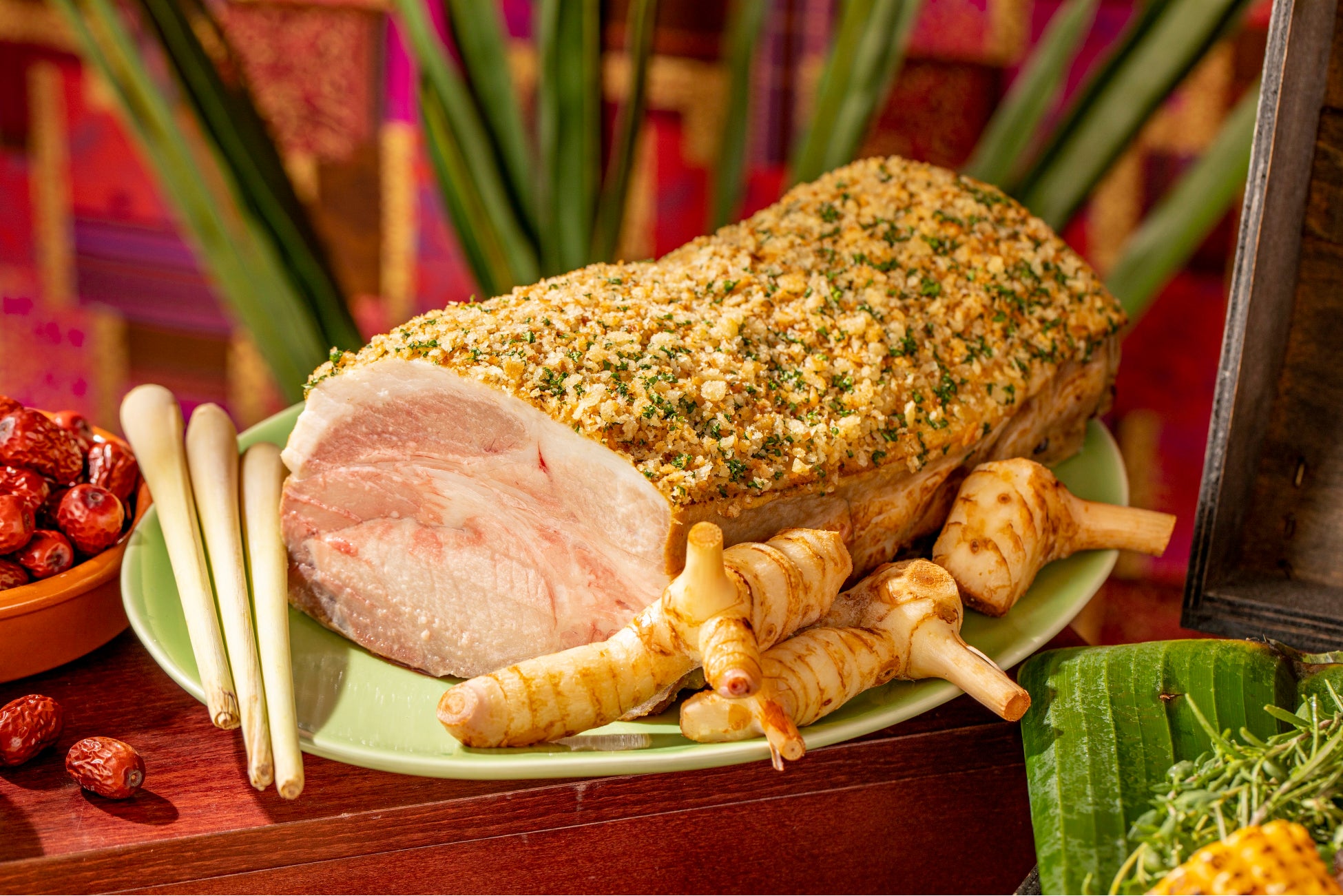ガランガルでマリネしたみかわ豚を、ハーブパン粉をまぶしてロースト。レモングラスのソースを添えて。