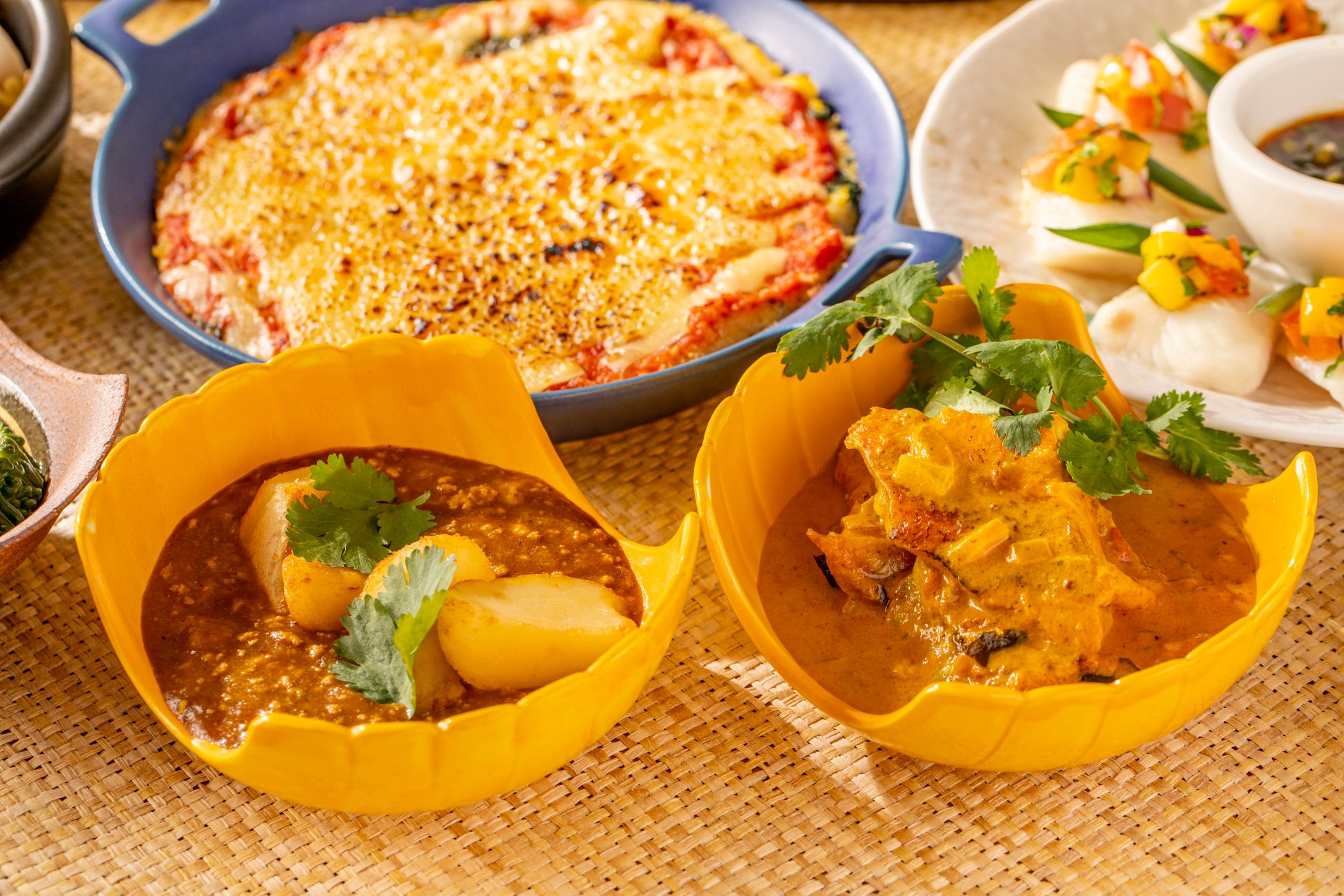 香港風パンガシウスのスチーム ライム・マンゴーソース/トックとチーズ入りファイヤーチキン/ズッキーニとほおずき入りメキシカンポークチリベルデ/パシフィックリムスタイルローストビーフ/フェタチーズとケールのポレンタラザニア/ゴーヤ、ミニポテト、プチオニオンのソテー サルサメヒカーナ添え(ヴィーガン)