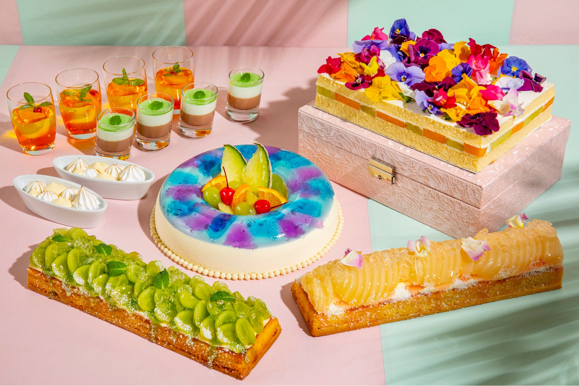 同時開催中のサマーデザートビュッフェ「Escape to LA」からウォーターエンゼルムース、ビバリーヒルズフルーツタルト、フラワーショートケーキ、サンセットオレンジゼリー、ミントチョコレートパンナコッタ、レモンタルト等、夏らしいスイーツ。