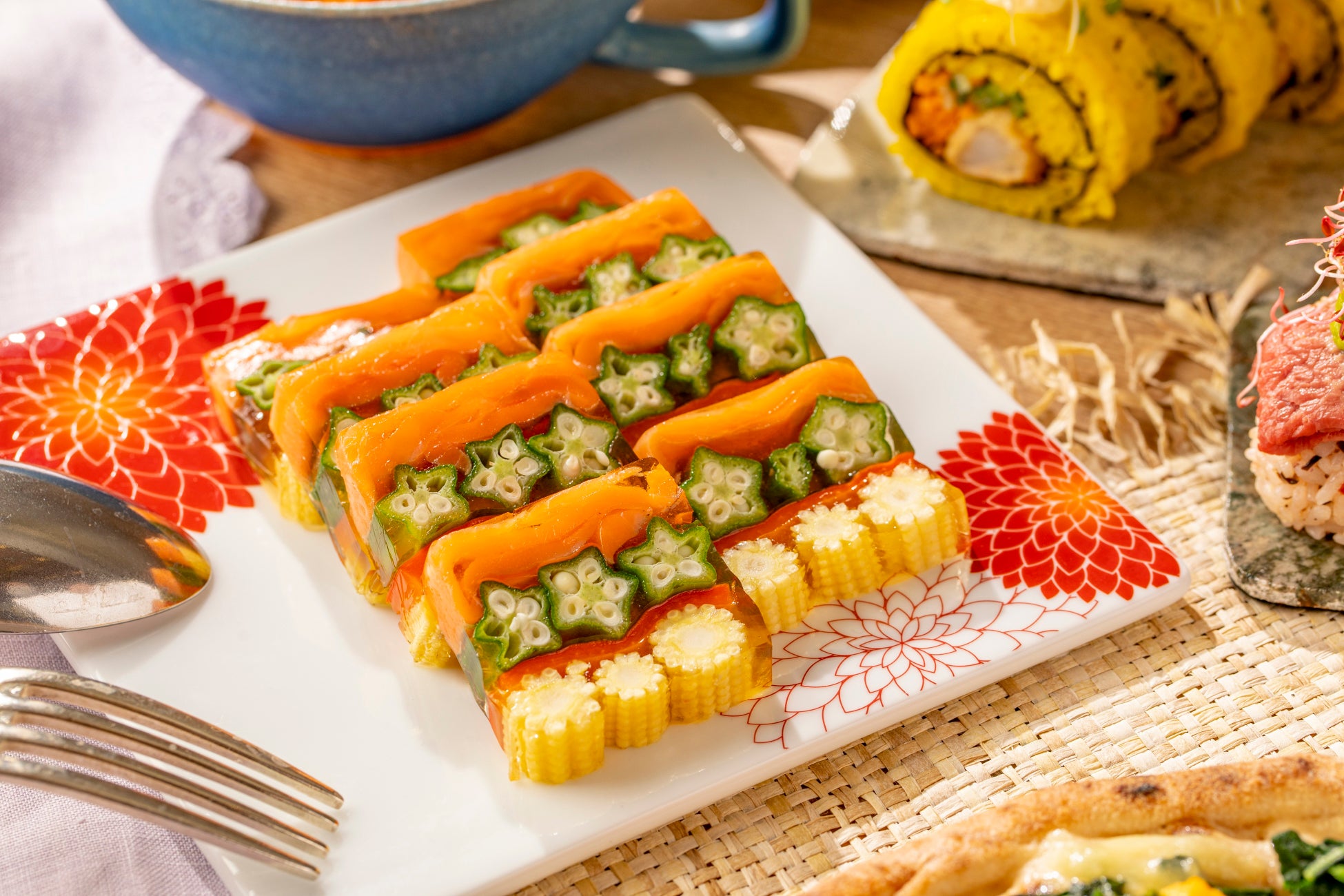 サーモンと野菜の色鮮やかなテリーヌ。ライムやレモングラスを加えて、東南アジア風にアレンジしたヴィエルジュソースを添えて。