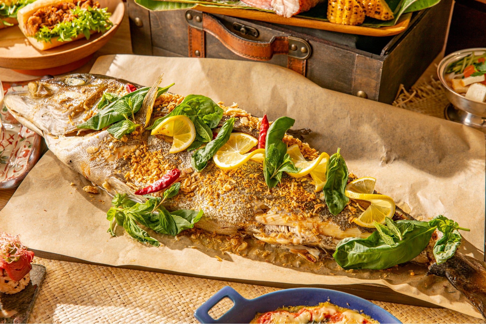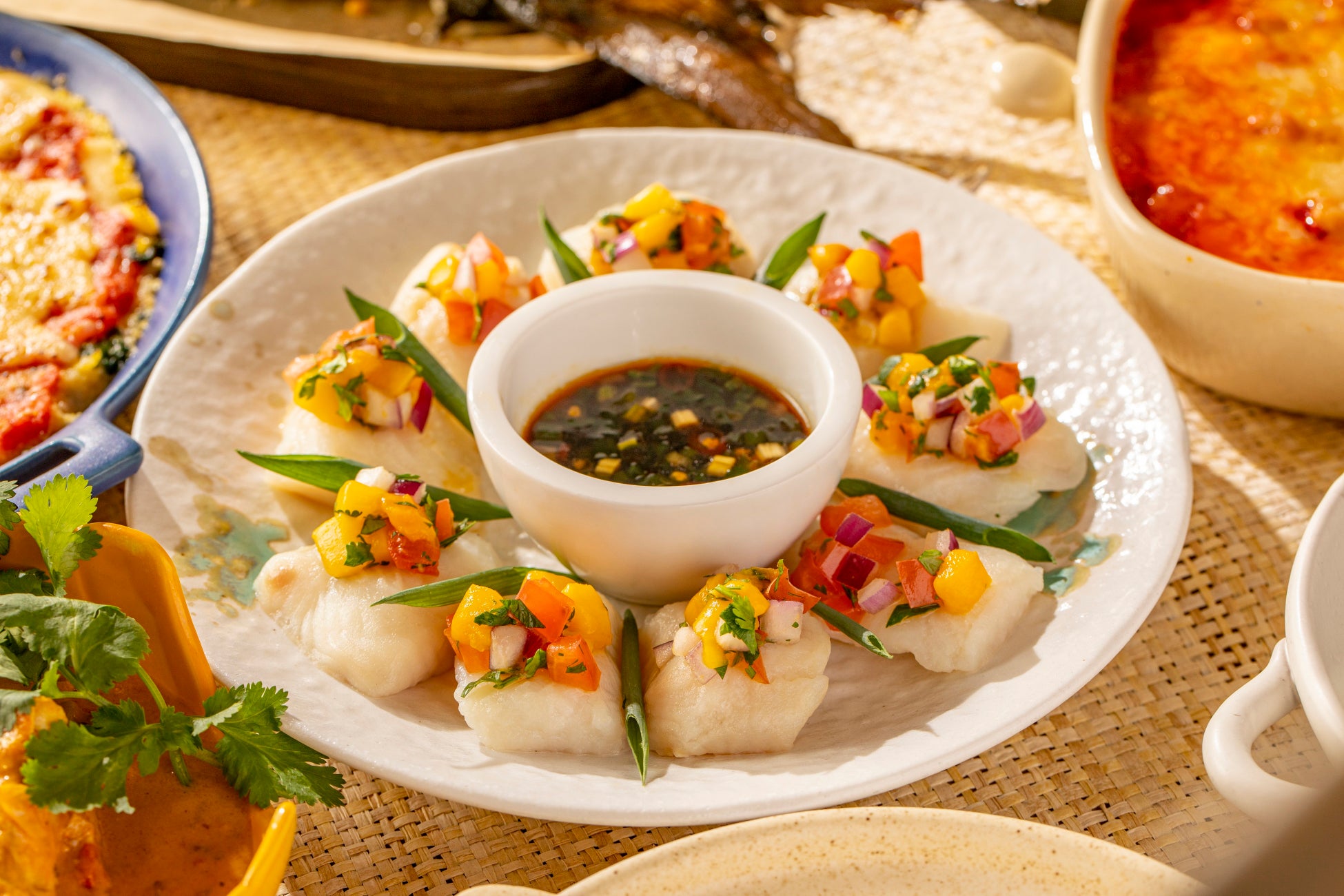 パンガシウスをニンニク、ショウガを効かせてスチーム。ライムやマンゴーでさわやかに仕上げた醤油ベースの香港風サルサソースで。